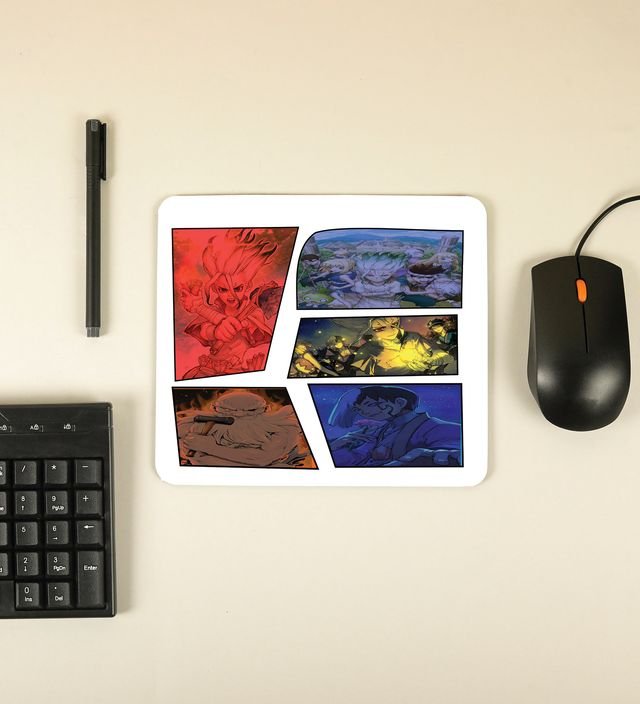 Unleash the power of science and creativity with this vibrant anime-style printed mousepad. Featuring a bold cutout design that reveals a lineup of dynamic characters set against a bright, clean background, this piece is perfect for fans of adventure, innovation, and post-apocalyptic storytelling