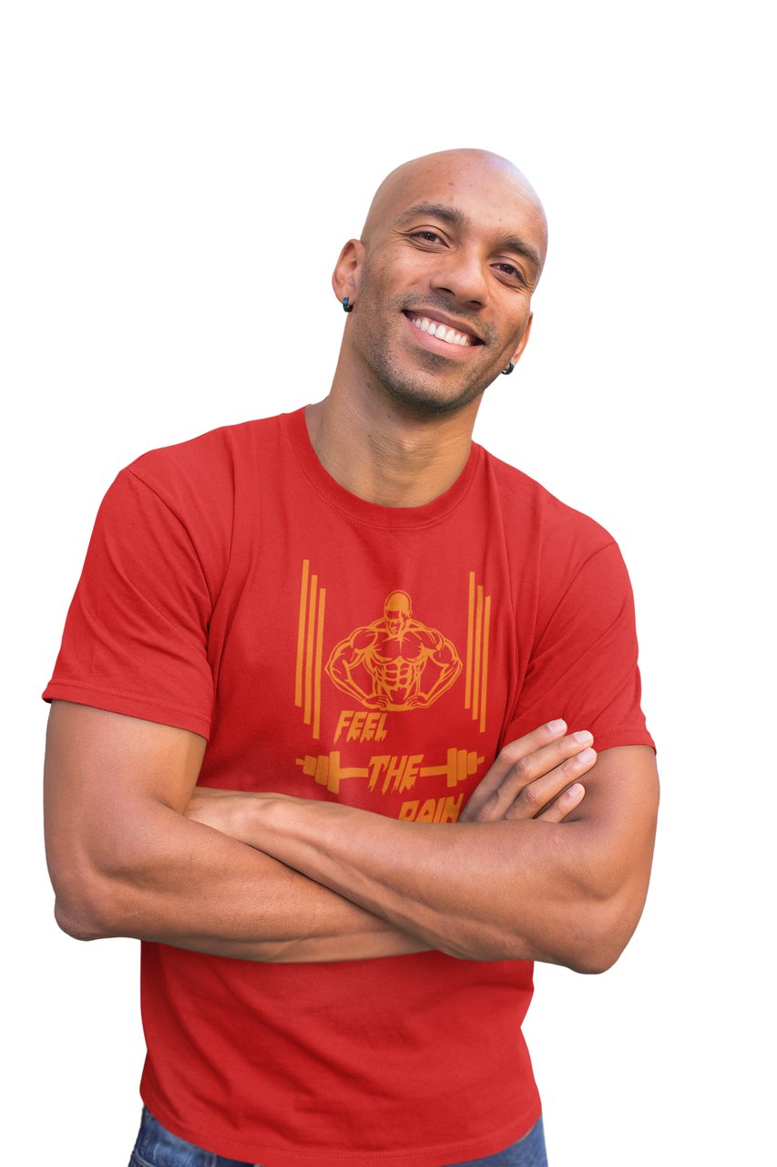 Feel The Pain, Straight Lines Round Neck Gym Tshirt (Orange) (Red Tshirt) - Clothes for Gym Lovers - Suitable for Gym Going Person - Foremost Gifting Material for Your Friends and Close Ones