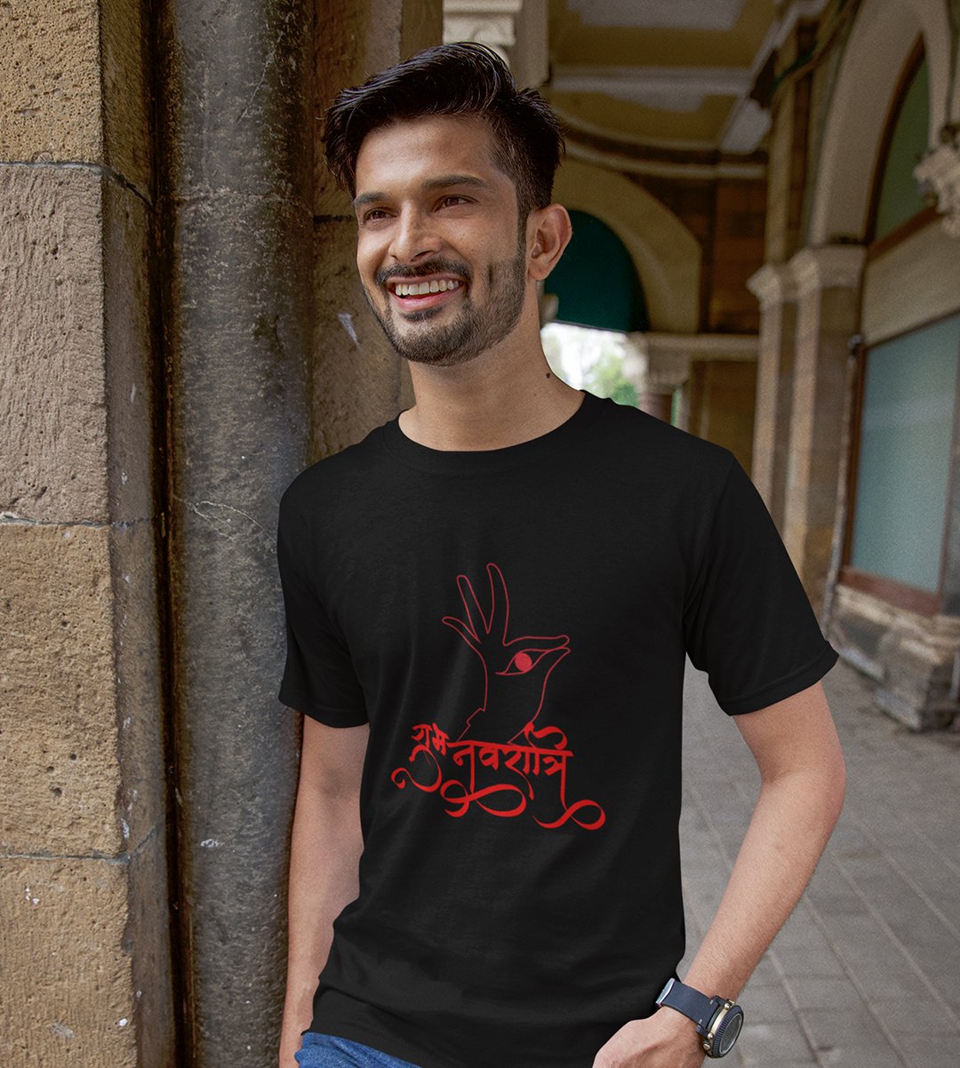 Navratri is a very auspicious festival for hindus. It takes place at the beginning of October and sometimes September. Enjoy the 9 days of festivities with full zeal and make yourself submerged in the love of Maa Durga. Navratri is also known as Durga Puja. And with this Tees, you can shine like a star during this festive season with our navratri themed cotton half sleeved Tshirts. You can pair our t-shirts with trousers and denim of your choice and make it a weekday smart casual or weekend wear. This is durable. This tshirt is smooth and soft which makes you comfortable to wear during all seasons. The printing in it is durable and odourless. It has five sizes, S,M,L,XL,XXL. The Tshirt colour is intact even after repeated washes. It can be kept in your wardrobe and hangers. Please avoid washing mashine to clean this Tee, it may affect the print. Hand wash only. We have brought you many navratri related designs printed on our different colour Tshirts to choose from. Grab it now.
