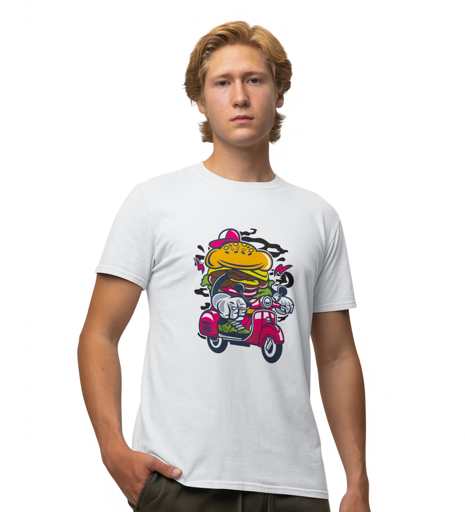 Rider Burger White Round Neck Cotton Half Sleeved Men's T-Shirt with Printed Graphics