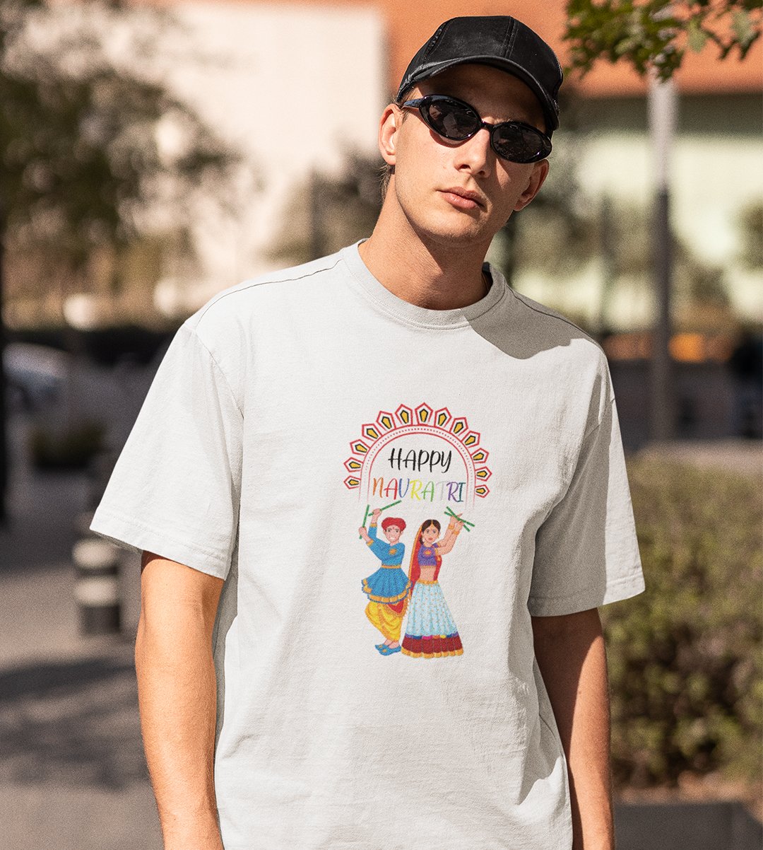 Garba dance couple printed unisex adults round neck cotton half-sleeve white tshirt specially for Navratri festival/ Durga puja