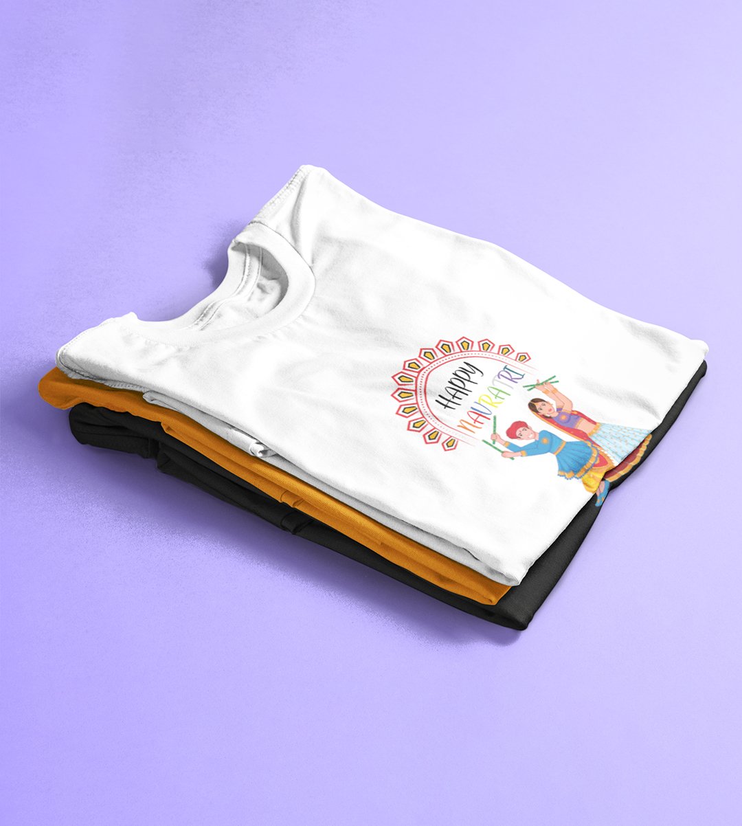 Navratri is a very auspicious festival for hindus. It takes place at the beginning of October and sometimes September. Enjoy the 9 days of festivities with full zeal and make yourself submerged in the love of Maa Durga. Navratri is also known as Durga Puja. And with this Tees, you can shine like a star during this festive season with our navratri themed cotton half sleeved Tshirts. You can pair our t-shirts with trousers and denim of your choice and make it a weekday smart casual or weekend wear. This is durable. This tshirt is smooth and soft which makes you comfortable to wear during all seasons. The printing in it is durable and odourless. It has five sizes, S,M,L,XL,XXL. The Tshirt colour is intact even after repeated washes. It can be kept in your wardrobe and hangers. Please avoid washing mashine to clean this Tee, it may affect the print. Hand wash only. We have brought you many navratri related designs printed on our different colour Tshirts to choose from. Grab it now.