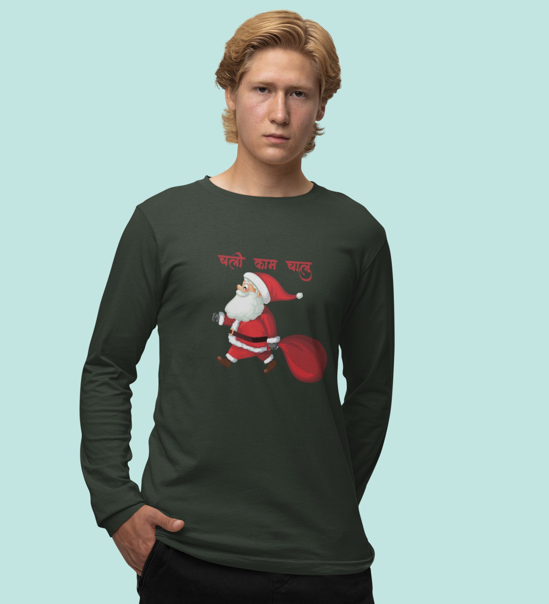 Get Back To Work Santa : Hydrate Festively withGreenFull Sleeve T-shirt - Leak-Proof, Marathi Printed Design