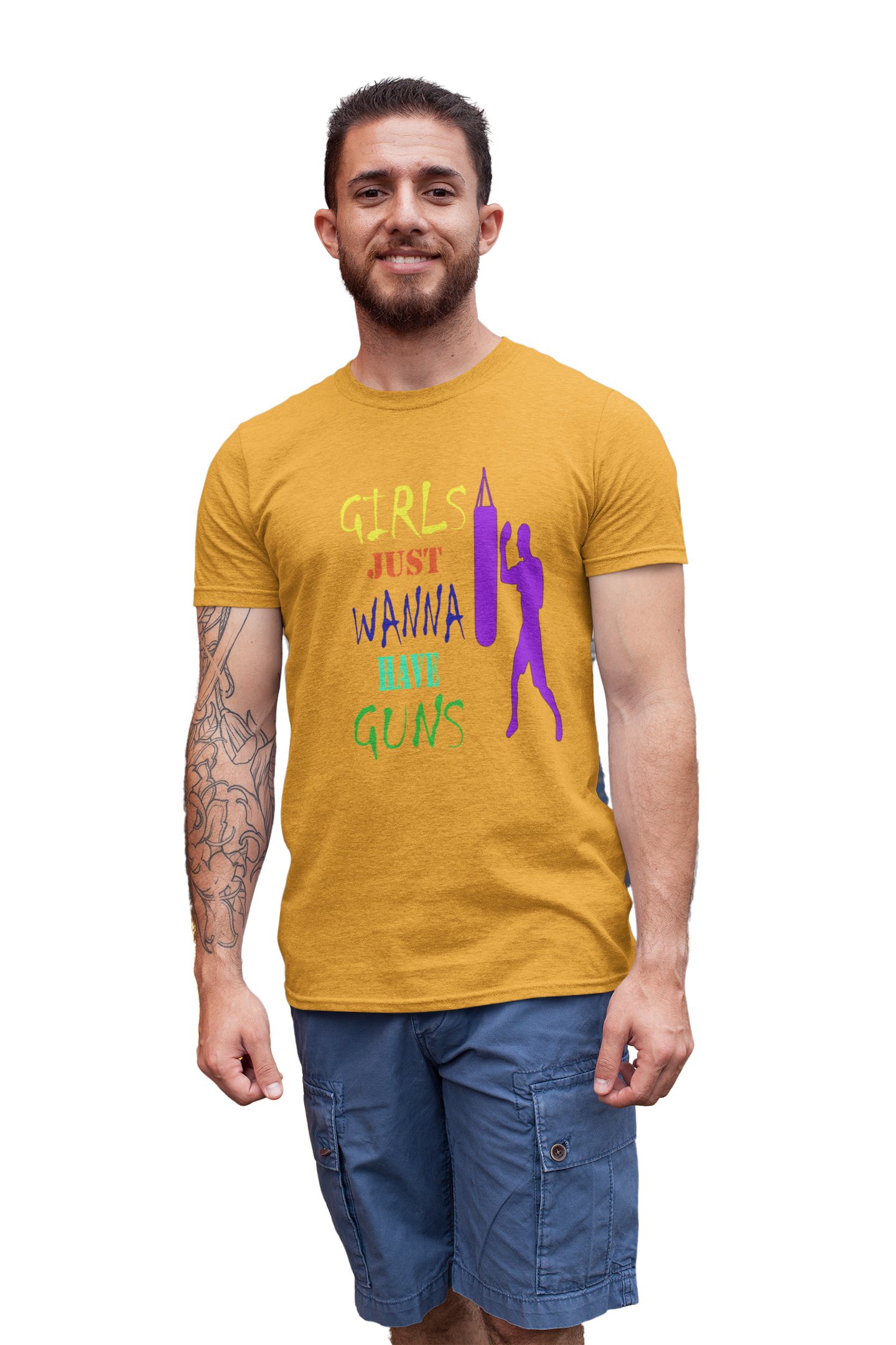 Girls Just Wanna Have Guns, Round Neck Gym Tshirt (Yellow Tshirt) - Clothes for Gym Lovers - Suitable for Gym Going Person - Foremost Gifting Material for Your Friends and Close Ones