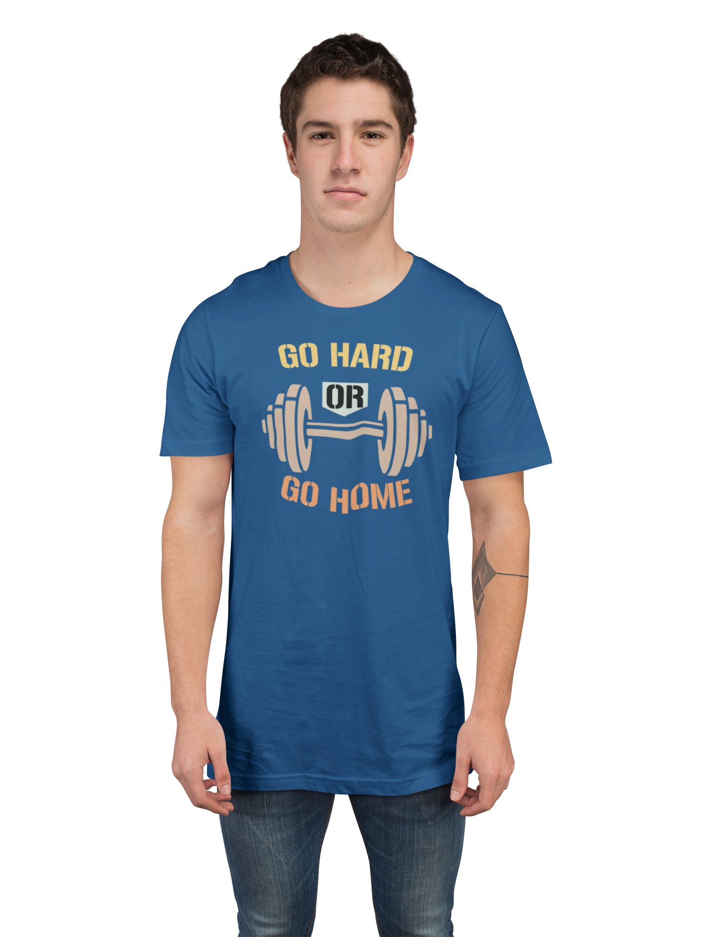 Go Hard Or Go Home, (BG Yellow, Orange, Black and Brown), Round Neck Gym Tshirt (Blue Tshirt) - Clothes for Gym Lovers - Suitable for Gym Going Person - Foremost Gifting Material for Your Friends and Close Ones