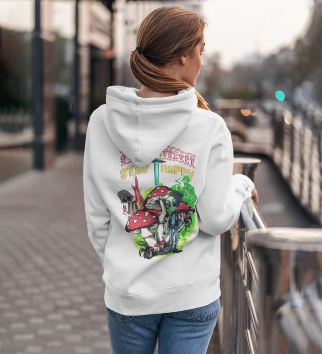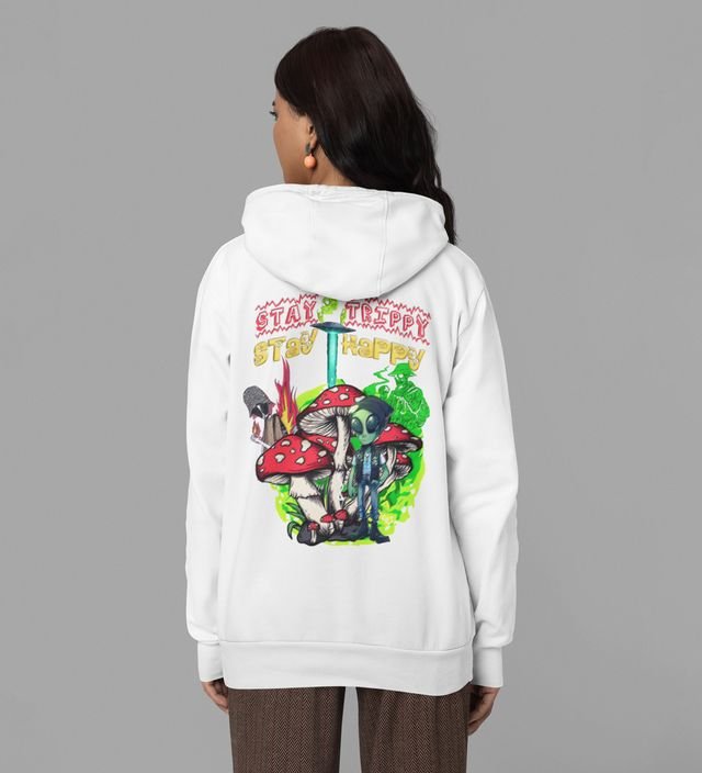Good Vibes Only Stay Trippy, Stay Happy White Cotton Printed Hoodies For Women