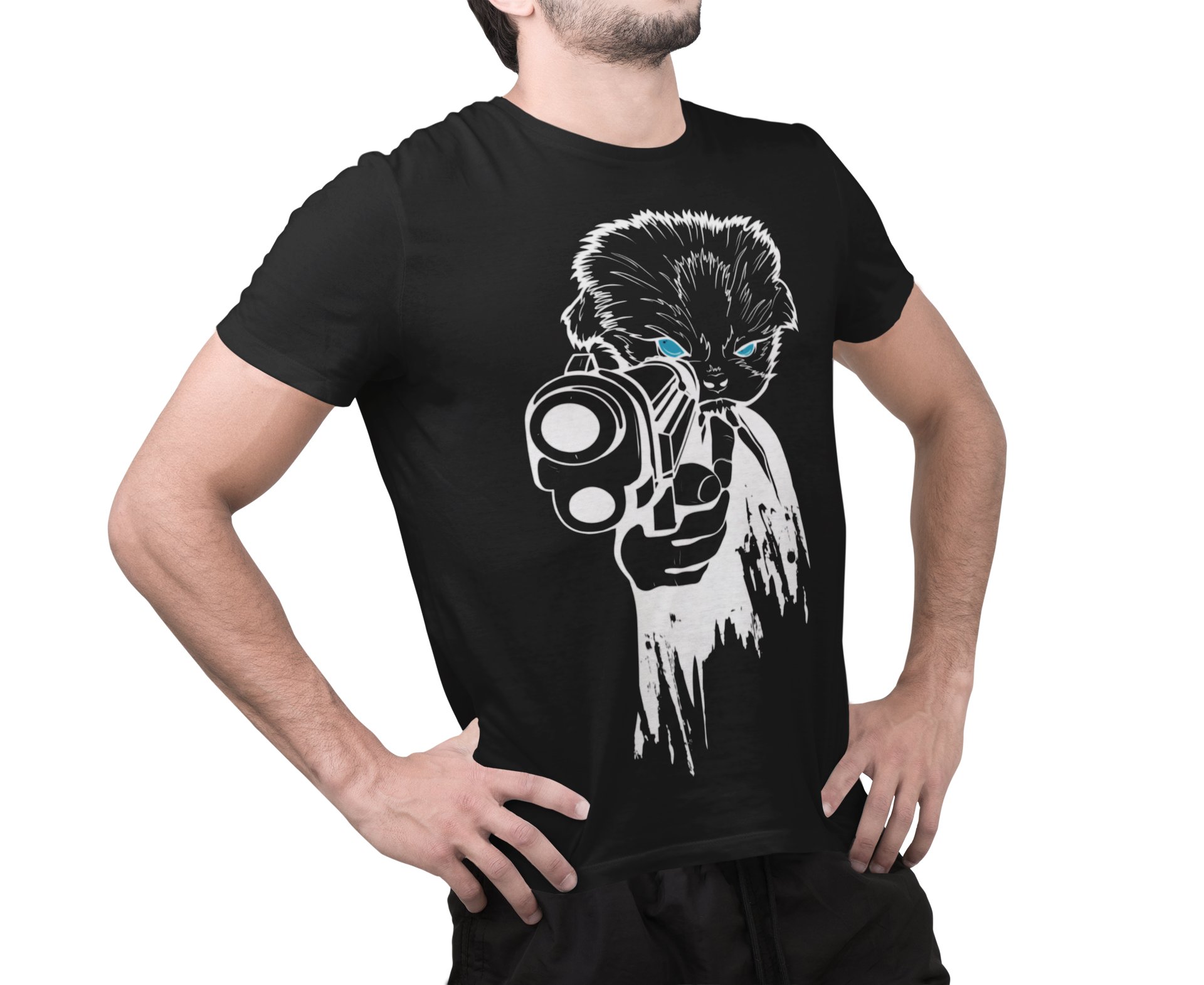 Gun with cool cat - Black - printed T-shirts - Men's stylish clothing - Cool tees for boysscary