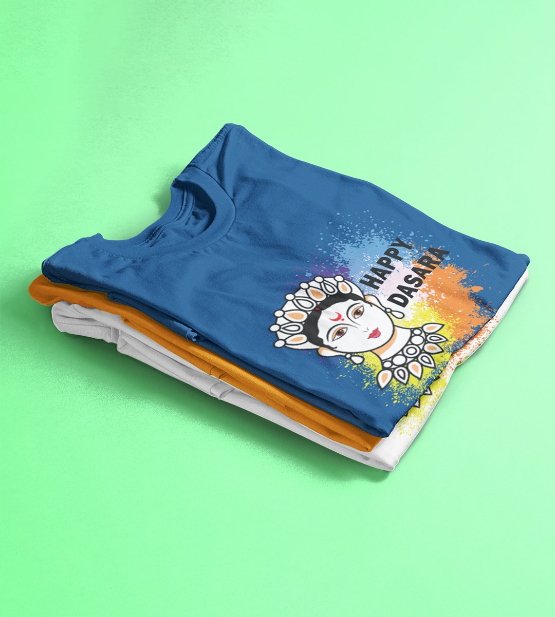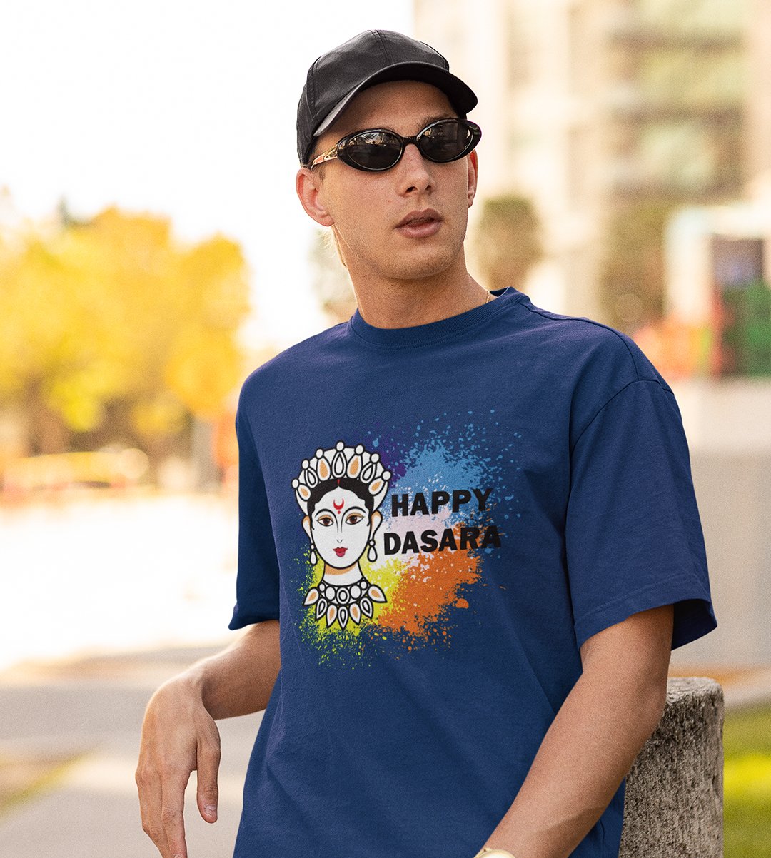 Happy Dasara (BG white) printed unisex adults round neck cotton half-sleeve blue tshirt specially for Navratri festival/ Durga puja