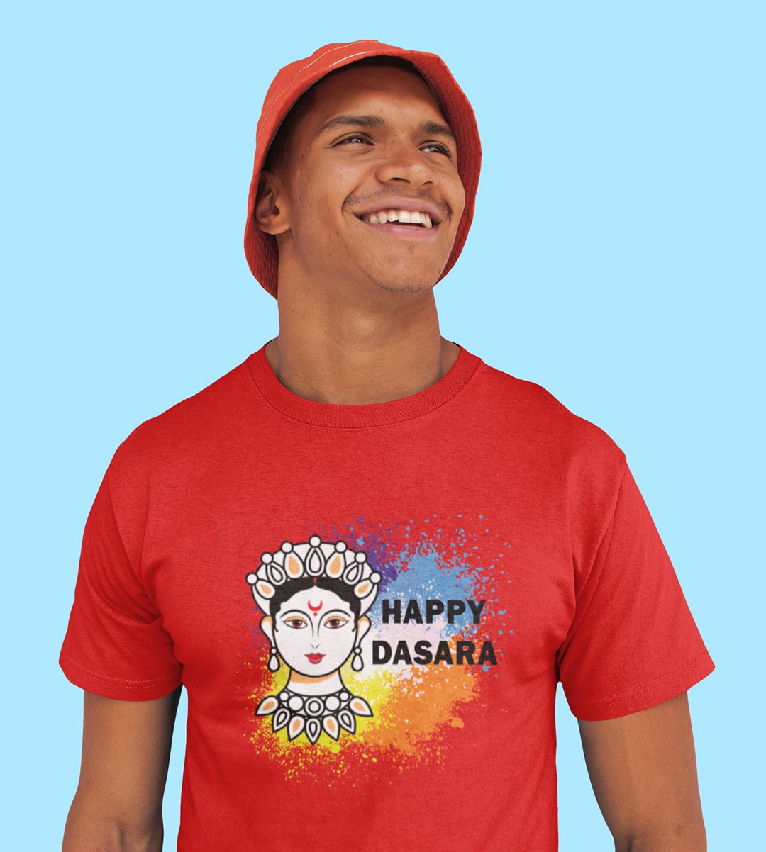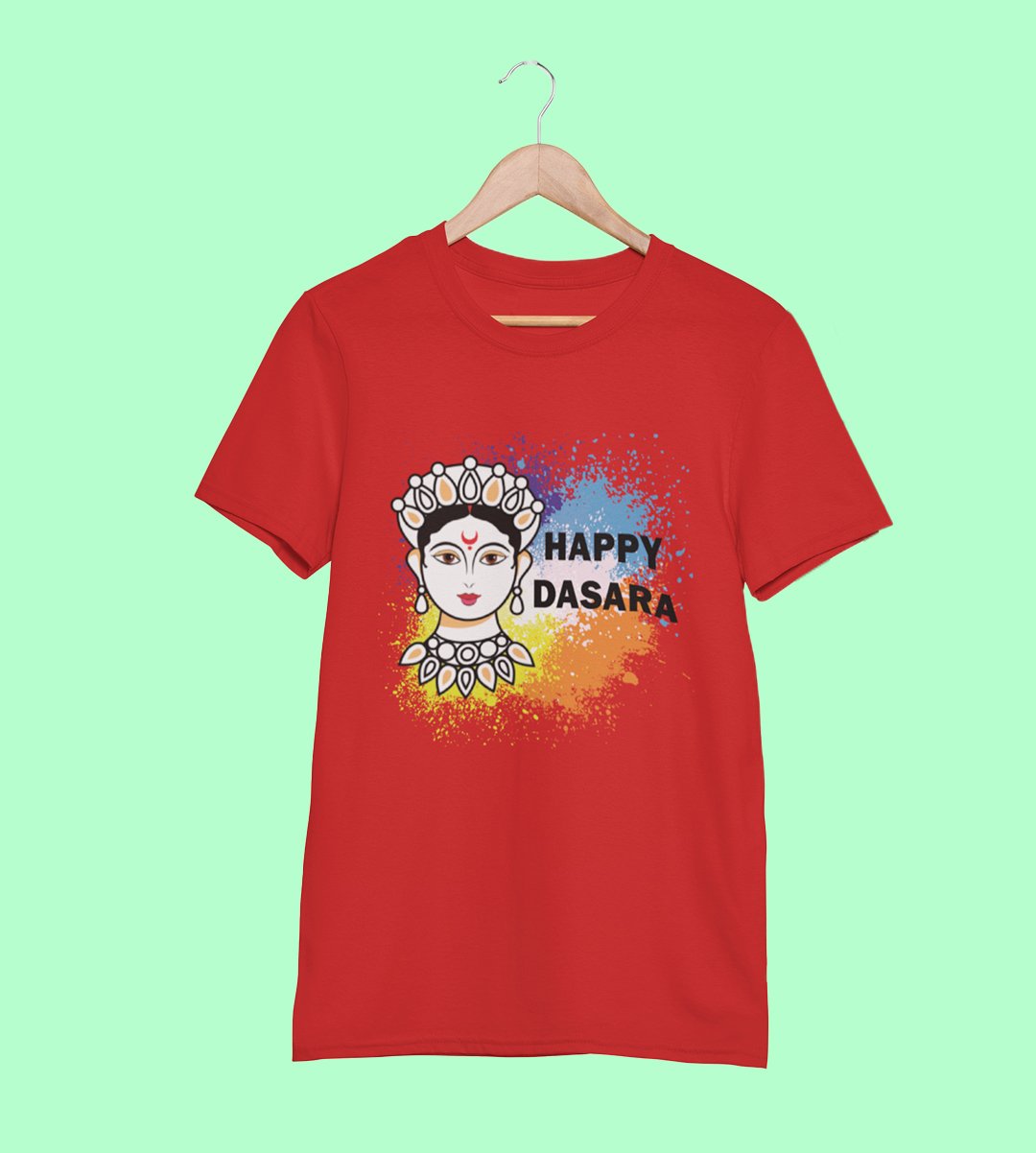 Happy Dasara (BG white) printed unisex adults round neck cotton half-sleeve red tshirt specially for Navratri festival/ Durga puja