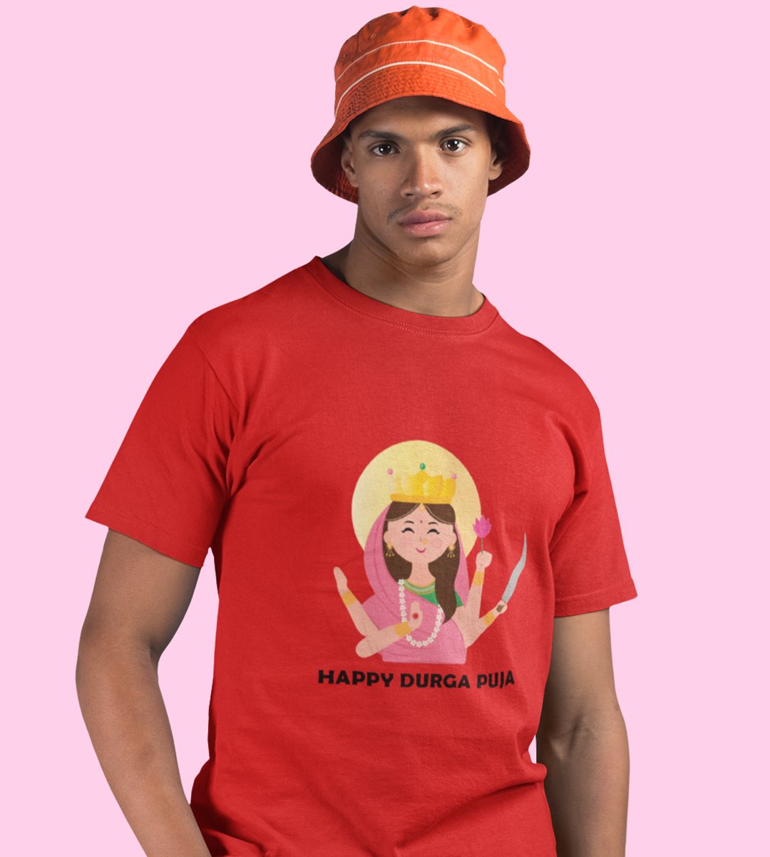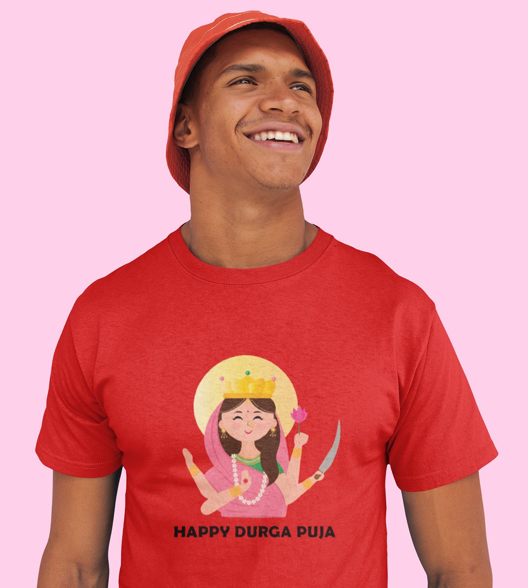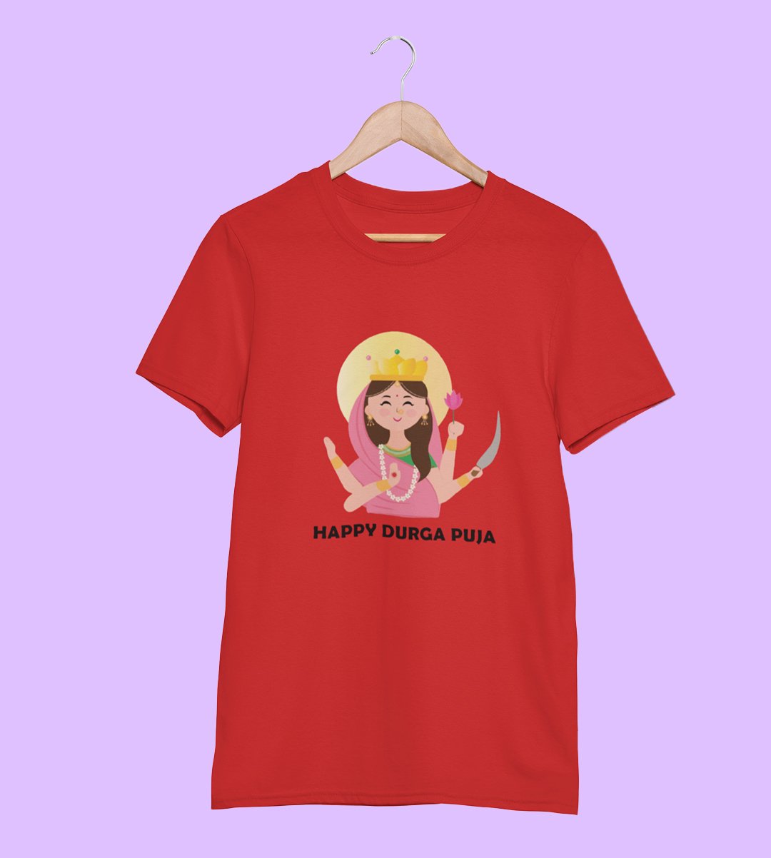 Happy durga puja printed unisex adults round neck cotton half-sleeve red tshirt specially for Navratri festival/ Durga puja