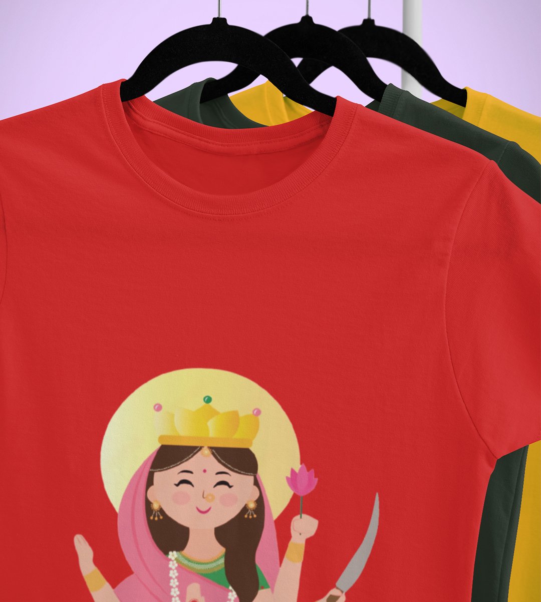 Navratri is a very auspicious festival for hindus. It takes place at the beginning of October and sometimes September. Enjoy the 9 days of festivities with full zeal and make yourself submerged in the love of Maa Durga. Navratri is also known as Durga Puja. And with this Tees, you can shine like a star during this festive season with our navratri themed cotton half sleeved Tshirts. You can pair our t-shirts with trousers and denim of your choice and make it a weekday smart casual or weekend wear. This is durable. This tshirt is smooth and soft which makes you comfortable to wear during all seasons. The printing in it is durable and odourless. It has five sizes, S,M,L,XL,XXL. The Tshirt colour is intact even after repeated washes. It can be kept in your wardrobe and hangers. Please avoid washing mashine to clean this Tee, it may affect the print. Hand wash only. We have brought you many navratri related designs printed on our different colour Tshirts to choose from. Grab it now.