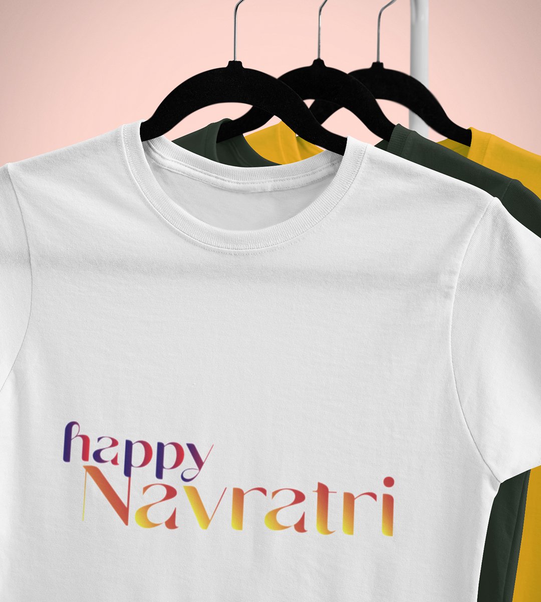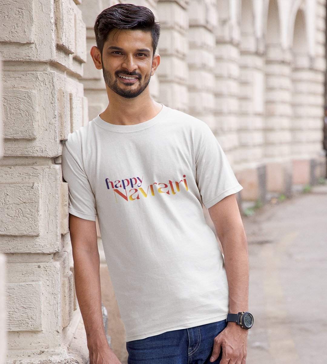 Happy Navratri (colourful text) printed unisex adults round neck cotton half-sleeve white tshirt specially for Navratri festival/ Durga puja