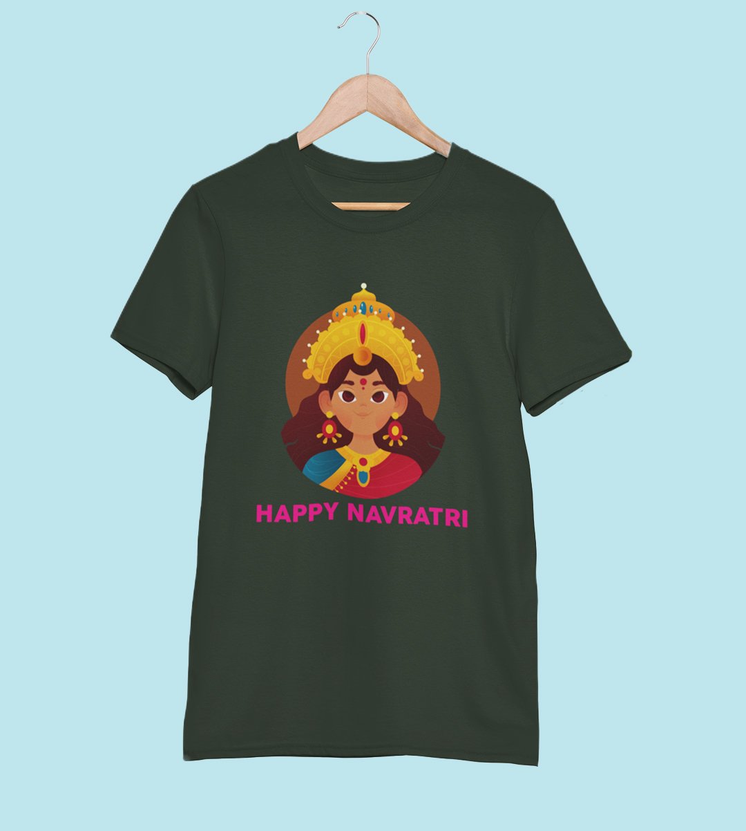 Happy Navratri (Durga ma face) printed unisex adults round neck cotton half-sleeve green tshirt specially for Navratri festival/ Durga puja