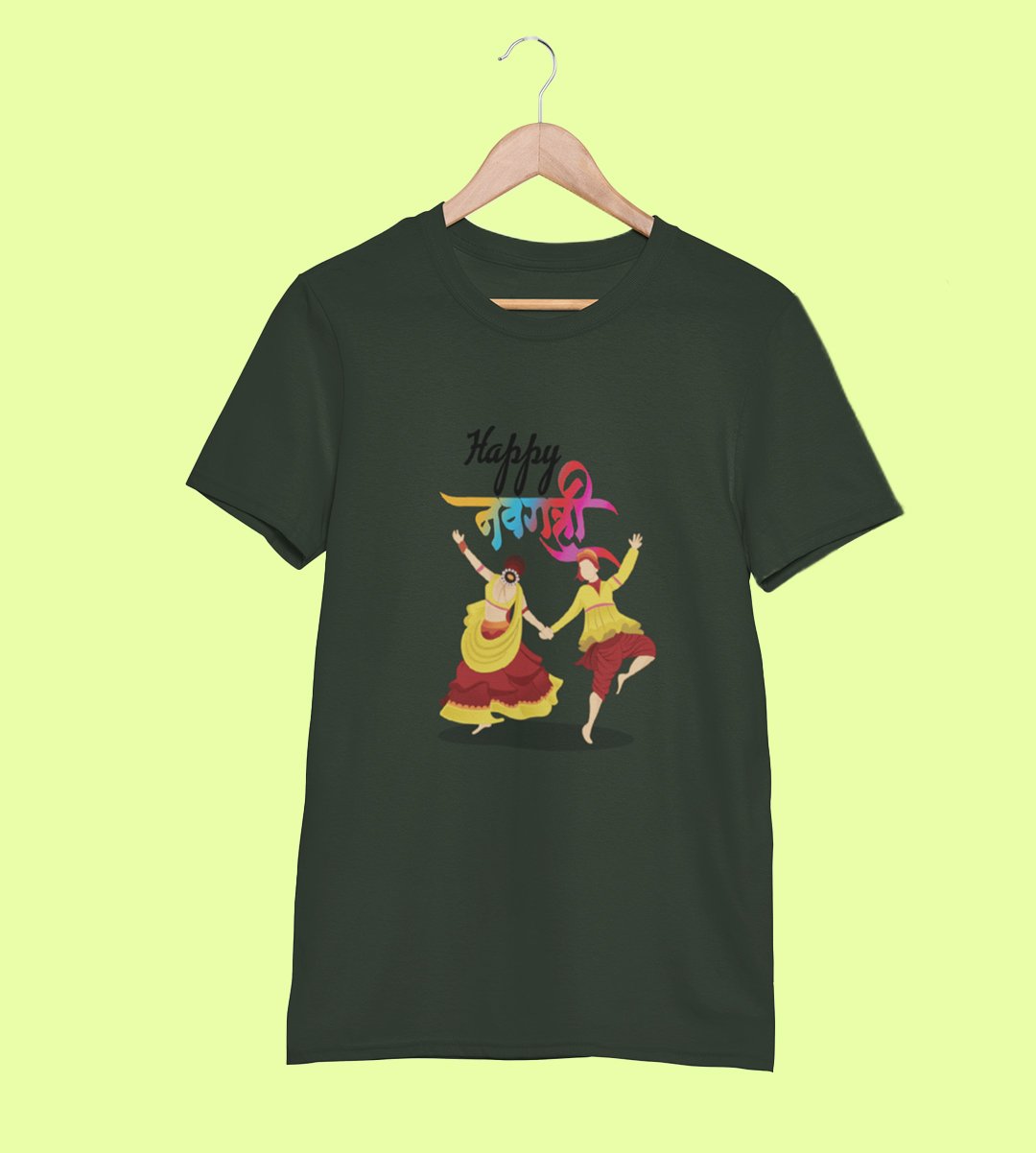 Happy navratri printed unisex adults round neck cotton half-sleeve green tshirt specially for Navratri festival/ Durga puja
