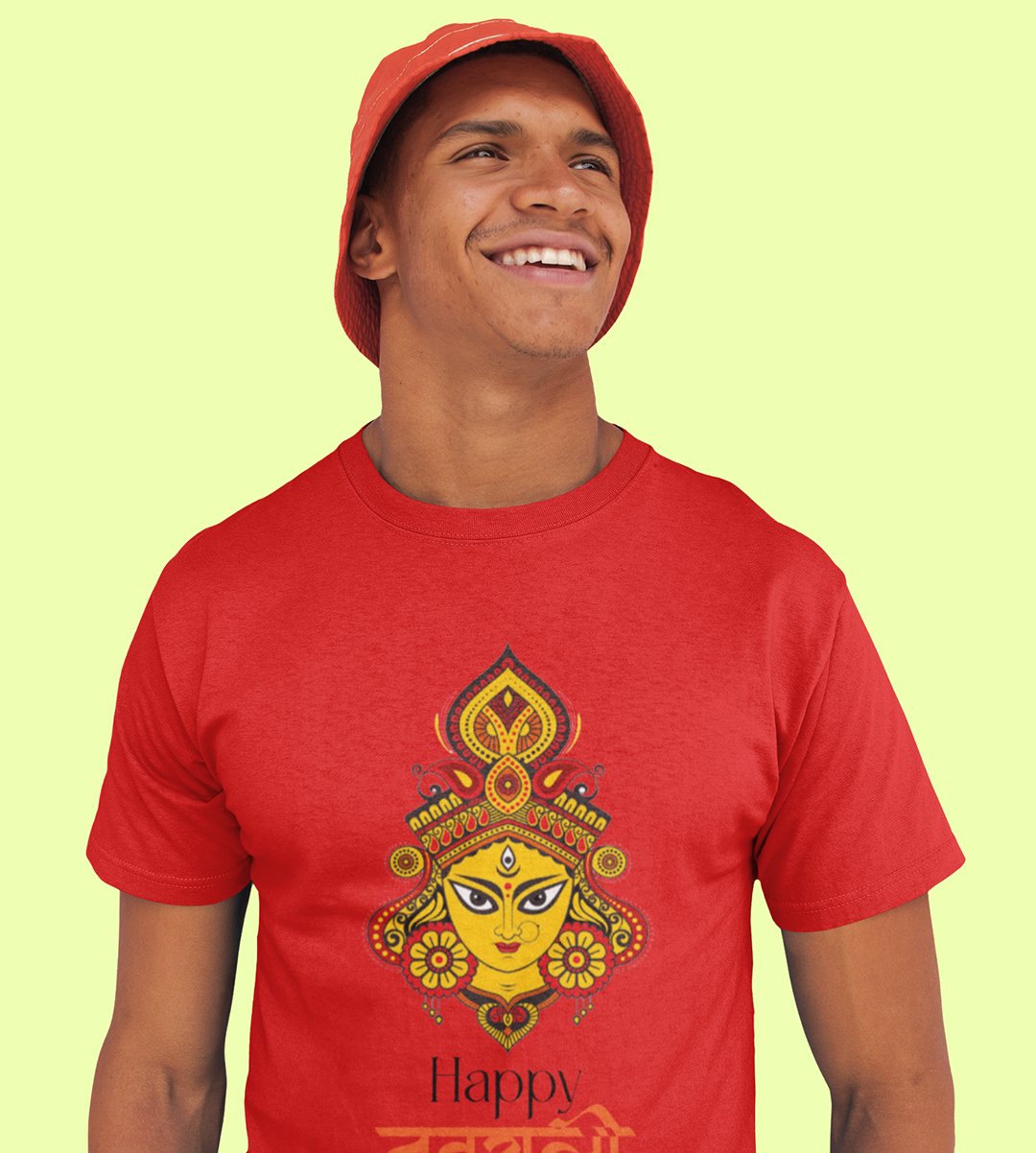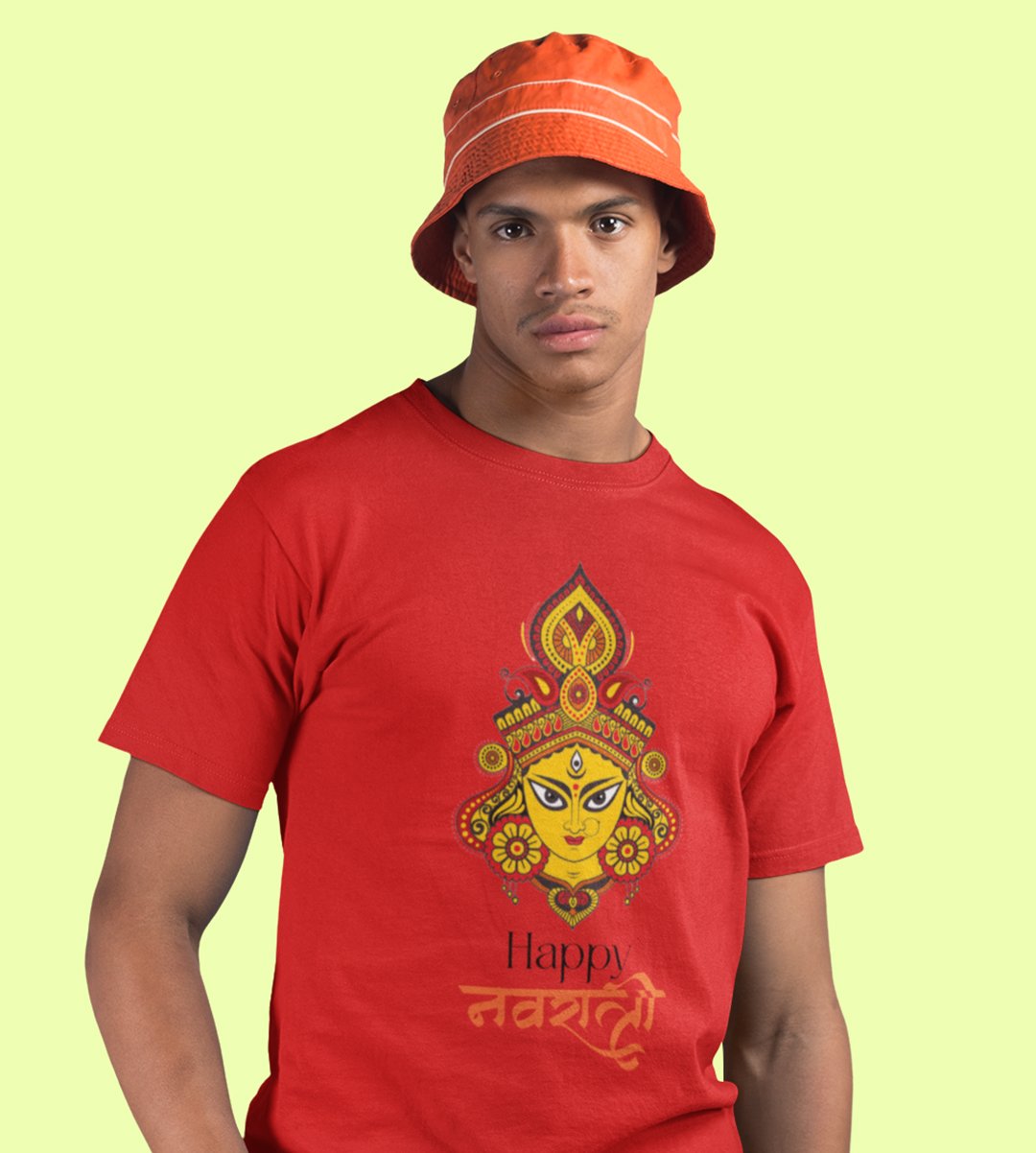 Happy Navratri (yellow) printed unisex adults round neck cotton half-sleeve red tshirt specially for Navratri festival/ Durga puja
