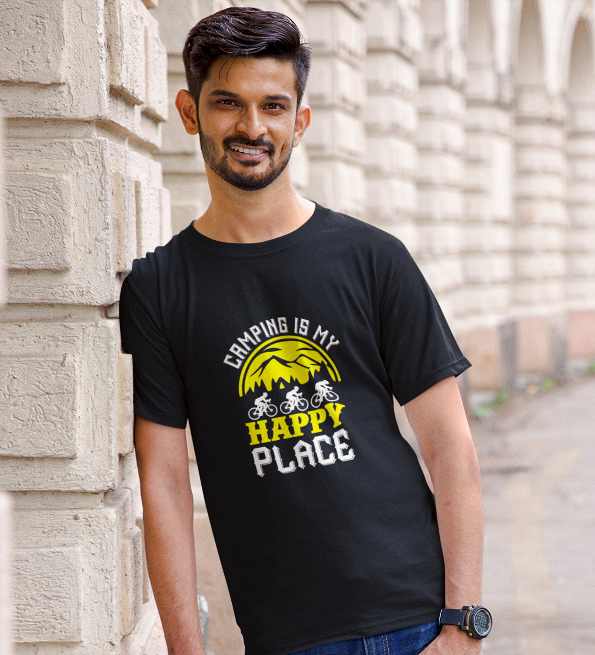 JD.TRENDS Camping- My Happy Place Black Round Neck Cotton Half Sleeved Men's T-Shirt with Printed Graphics