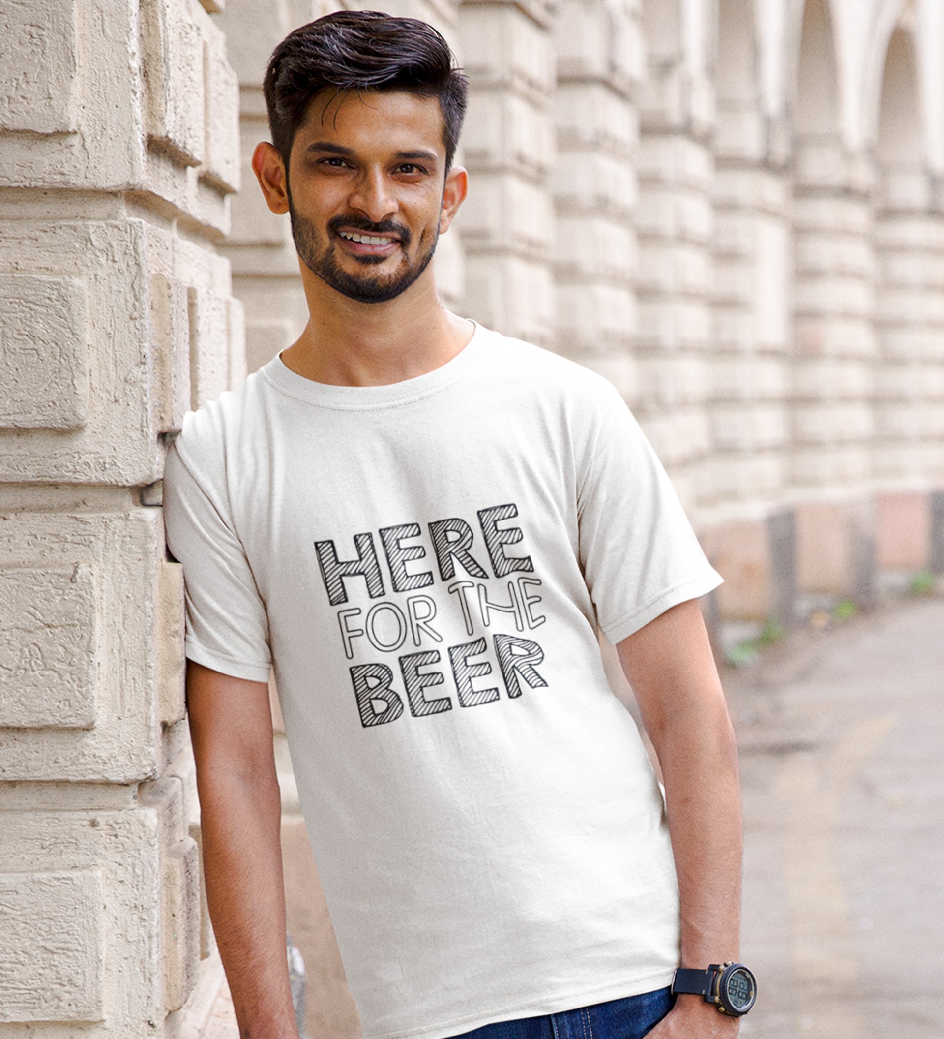 Here For The Beer White Round Neck Cotton Half Sleeved Men's T-Shirt with Printed Graphics