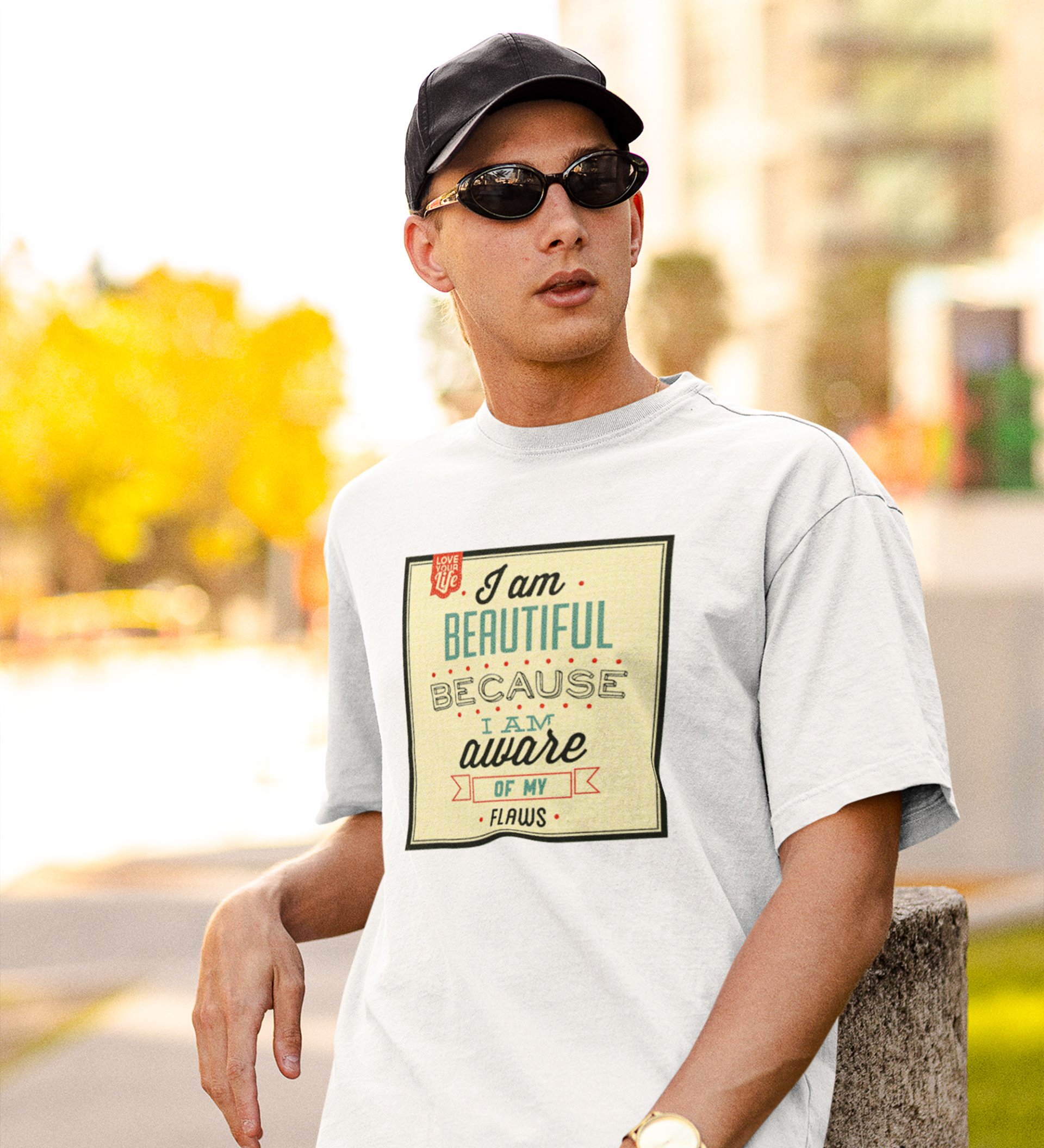 Flaws Are Beauty White Round Neck Cotton Half Sleeved Men's T-Shirt with Printed Graphics
