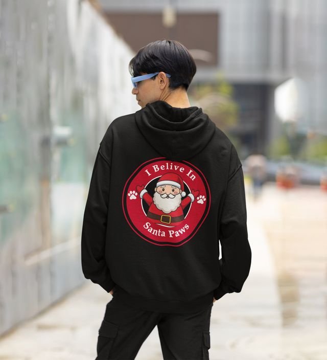 I Believe in Santa Paws in Cheerful Lettering Printed Black Cotton Hoodie