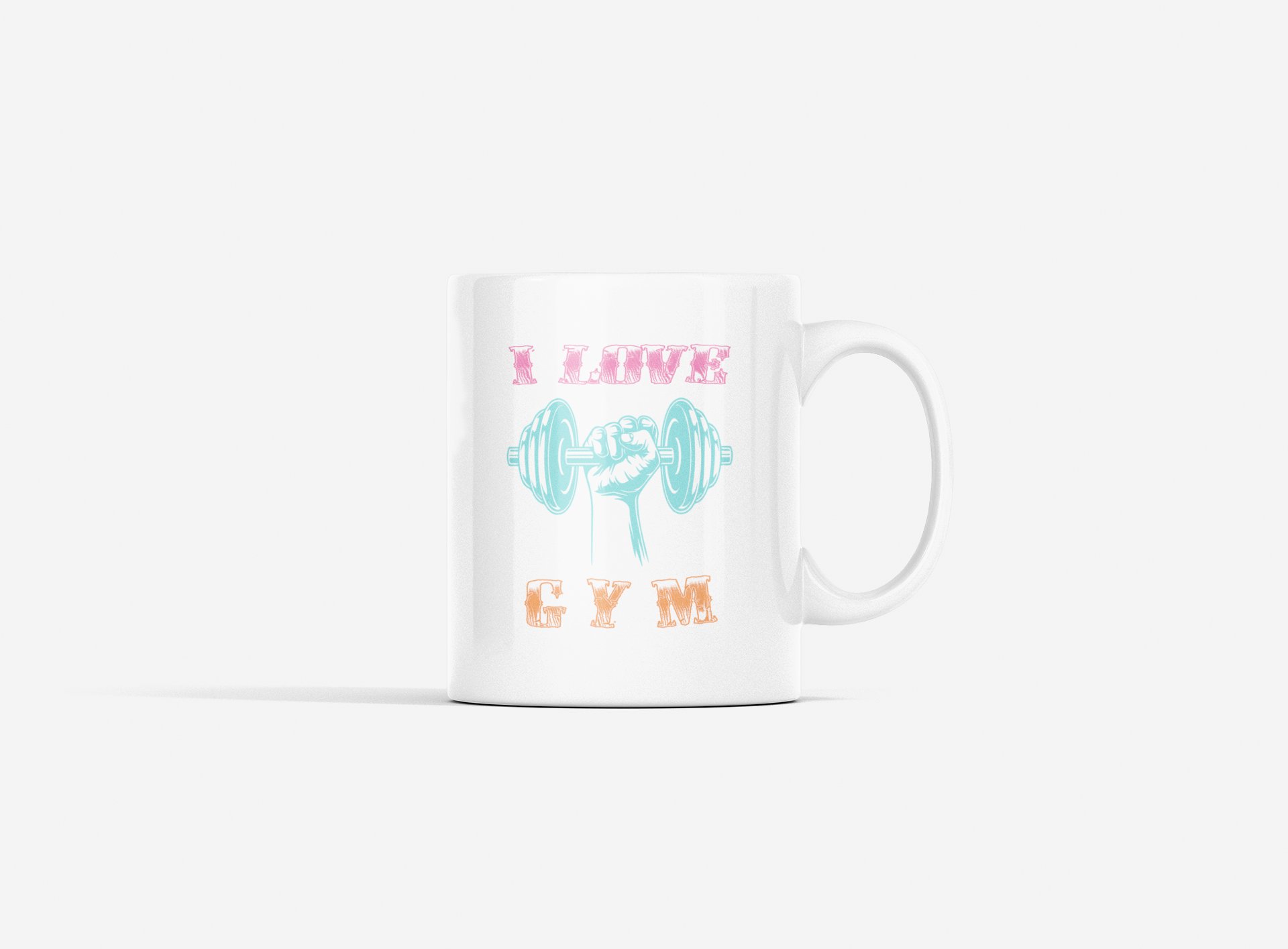 I Love Gym, (BG Pink, White and Orange) - gym themed printed ceramic white coffee and tea mugs/ cups for gym lovers