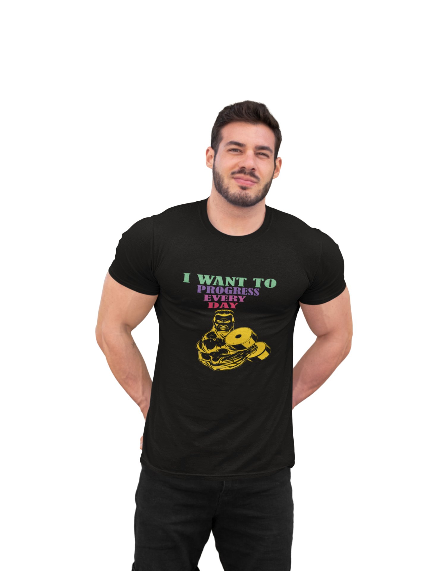 I Want to Progress Everyday, (BG Yellow), Round Neck Gym Tshirt (Black Tshirt) - Clothes for Gym Lovers - Suitable for Gym Going Person - Foremost Gifting Material for Your Friends and Close Ones