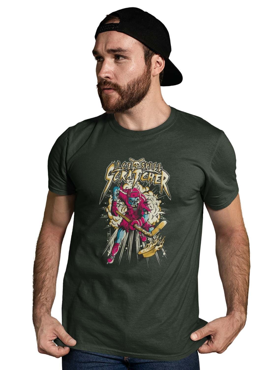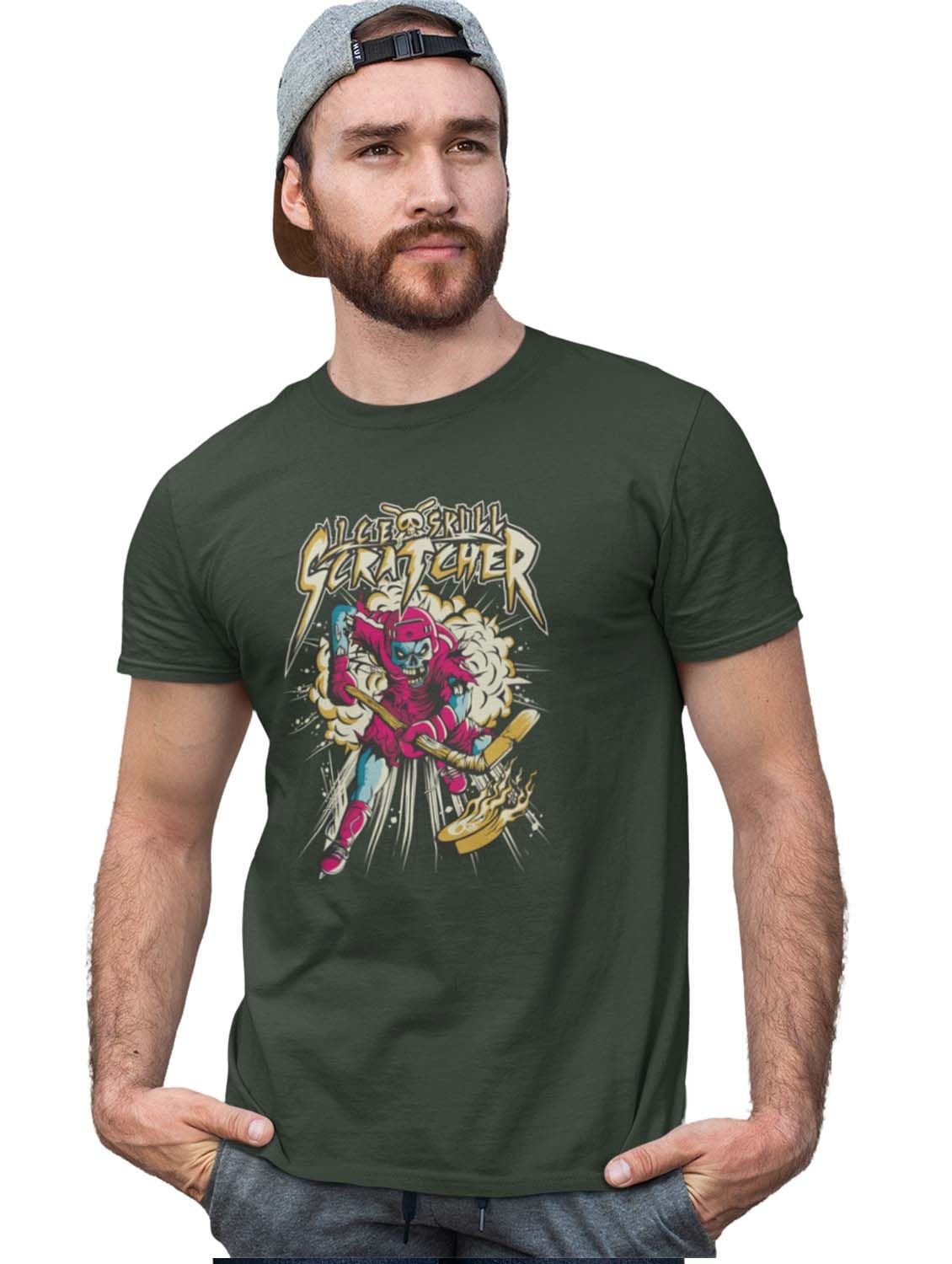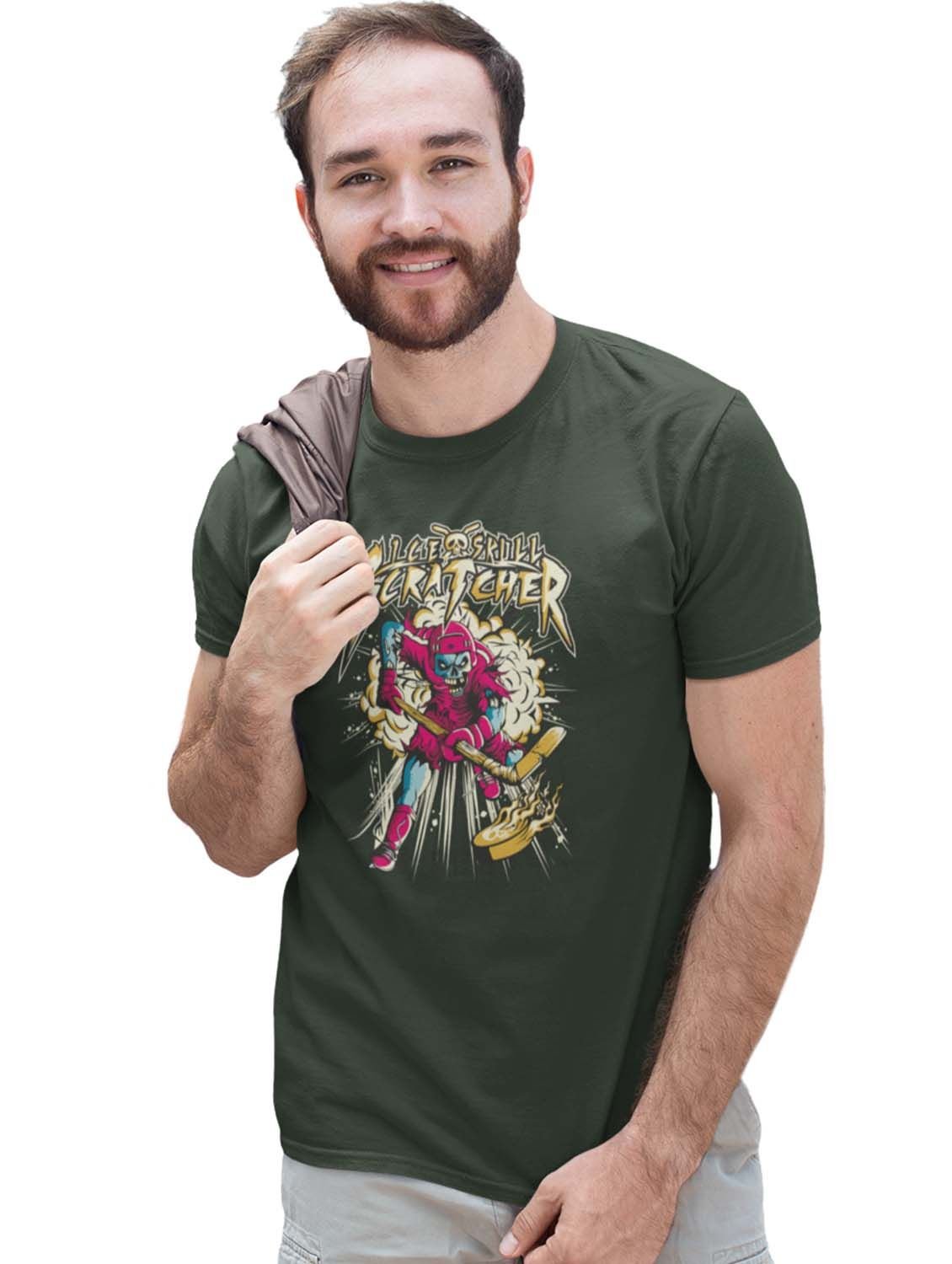 Skull Ice Hockey Green Round Neck Cotton Half Sleeved T-Shirt with Printed Graphics