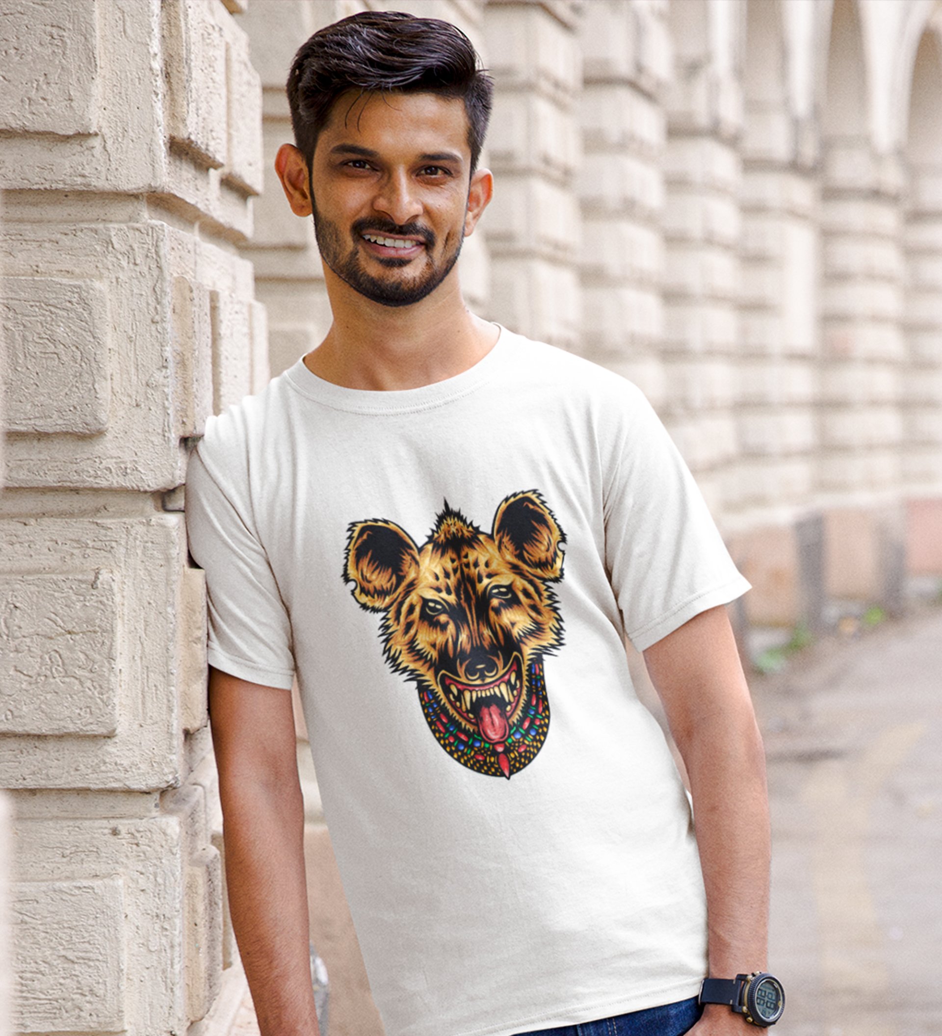 Hyena White Round Neck Cotton Half Sleeved Men's T-Shirt with Printed Graphics
