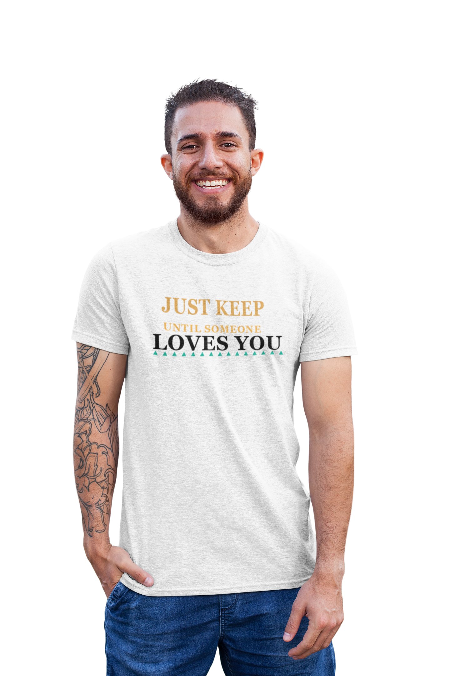 Just Keep Working Out Until Someone Loves You, (BG Yellow, Black And White), Round Neck Gym Tshirt (White Tshirt) - Clothes for Gym Lovers - Foremost Gifting Material for Your Friends and Close Ones