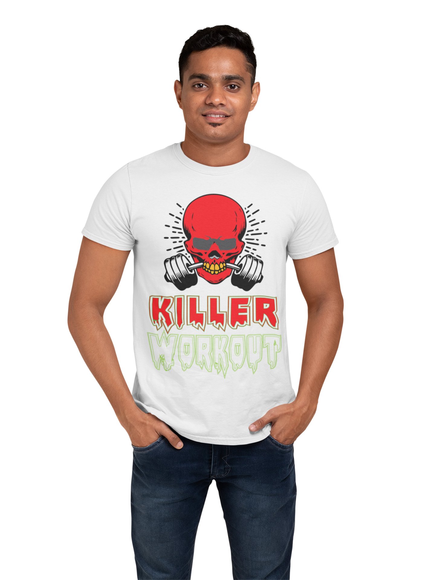 Killer Workout, (BG Red and White), Round Neck Gym Tshirt (White Tshirt) - Clothes for Gym Lovers - Suitable for Gym Going Person - Foremost Gifting Material for Your Friends and Close Ones