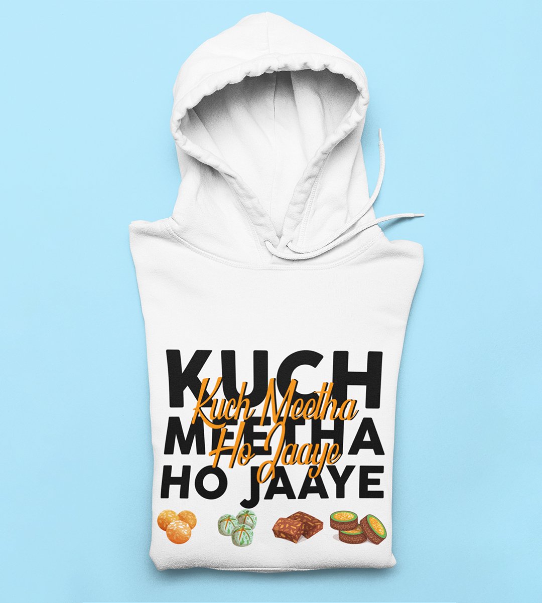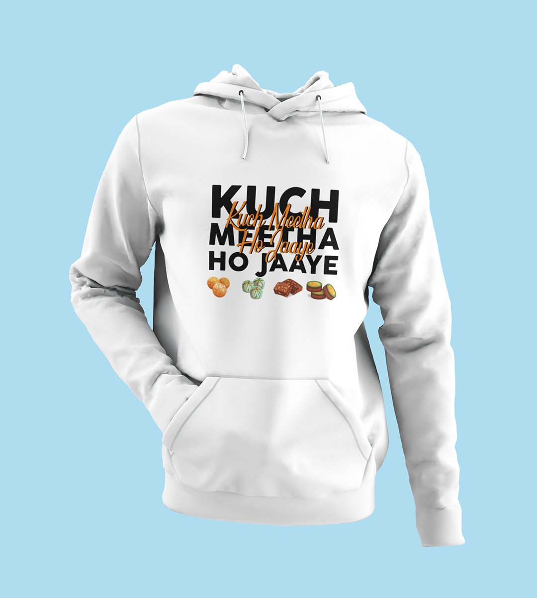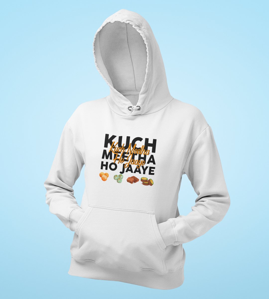 Satisfy your sweet cravings with our "Sweet Indulgence" White Hoodie . The message "Kuch Meetha Ho Jaye" invites you to dive into a delightful world of sweets and treats. This playful design features an array of delectable confections, making every sip a celebration of sweetness and joy.