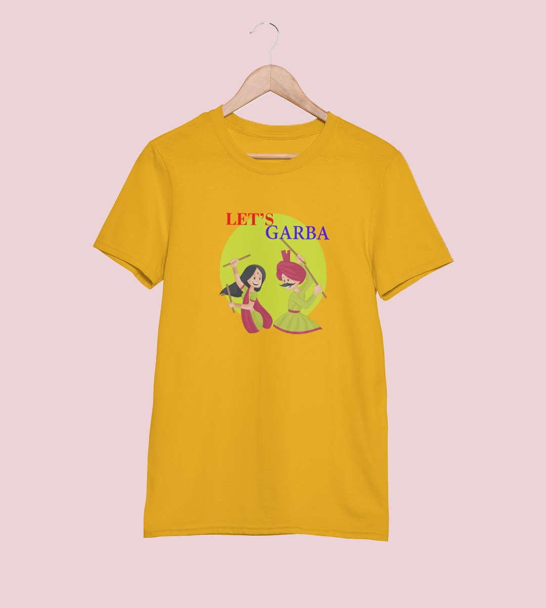 Let's garba printed unisex adults round neck cotton half-sleeve yellow tshirt specially for Navratri festival/ Durga puja