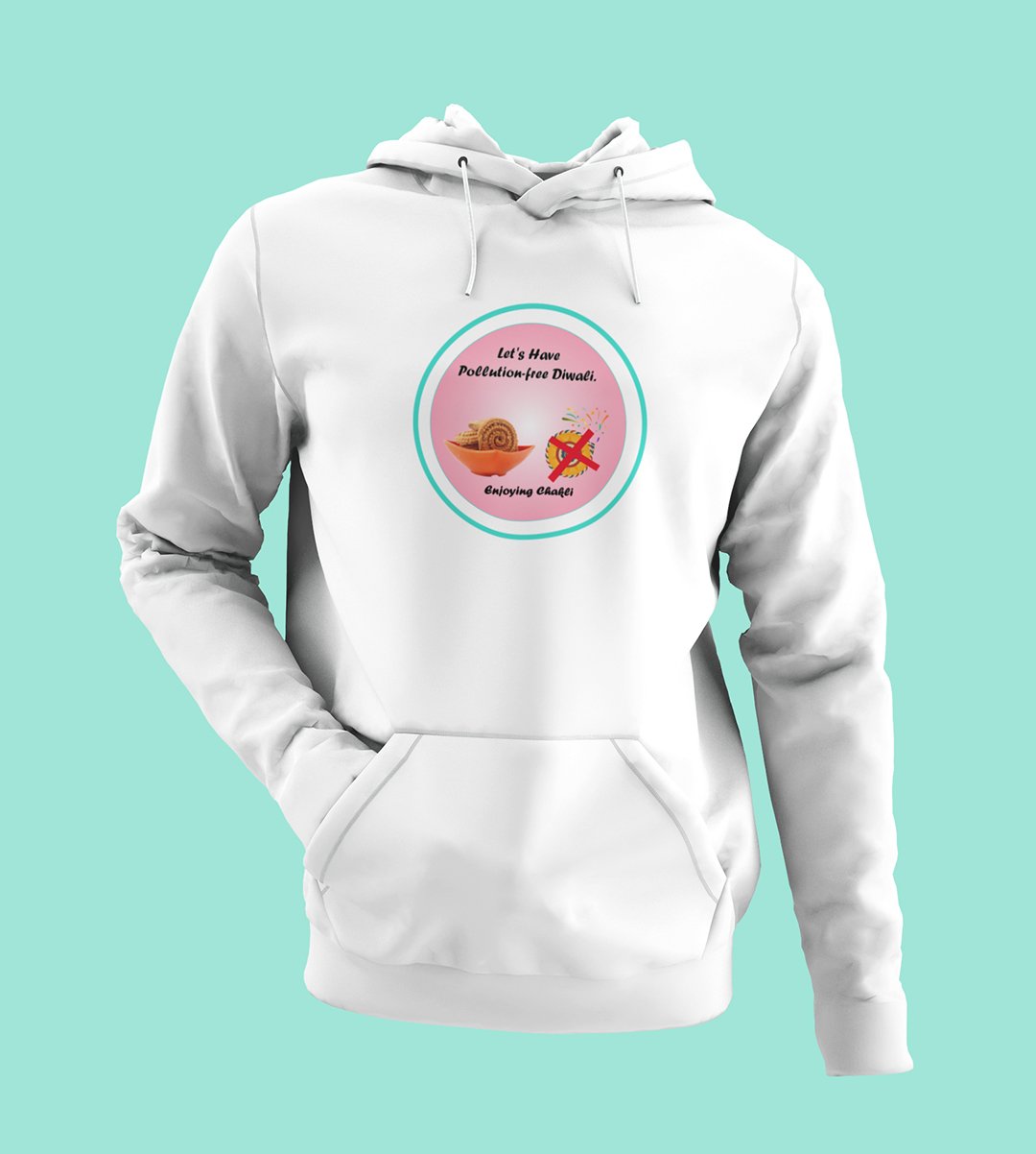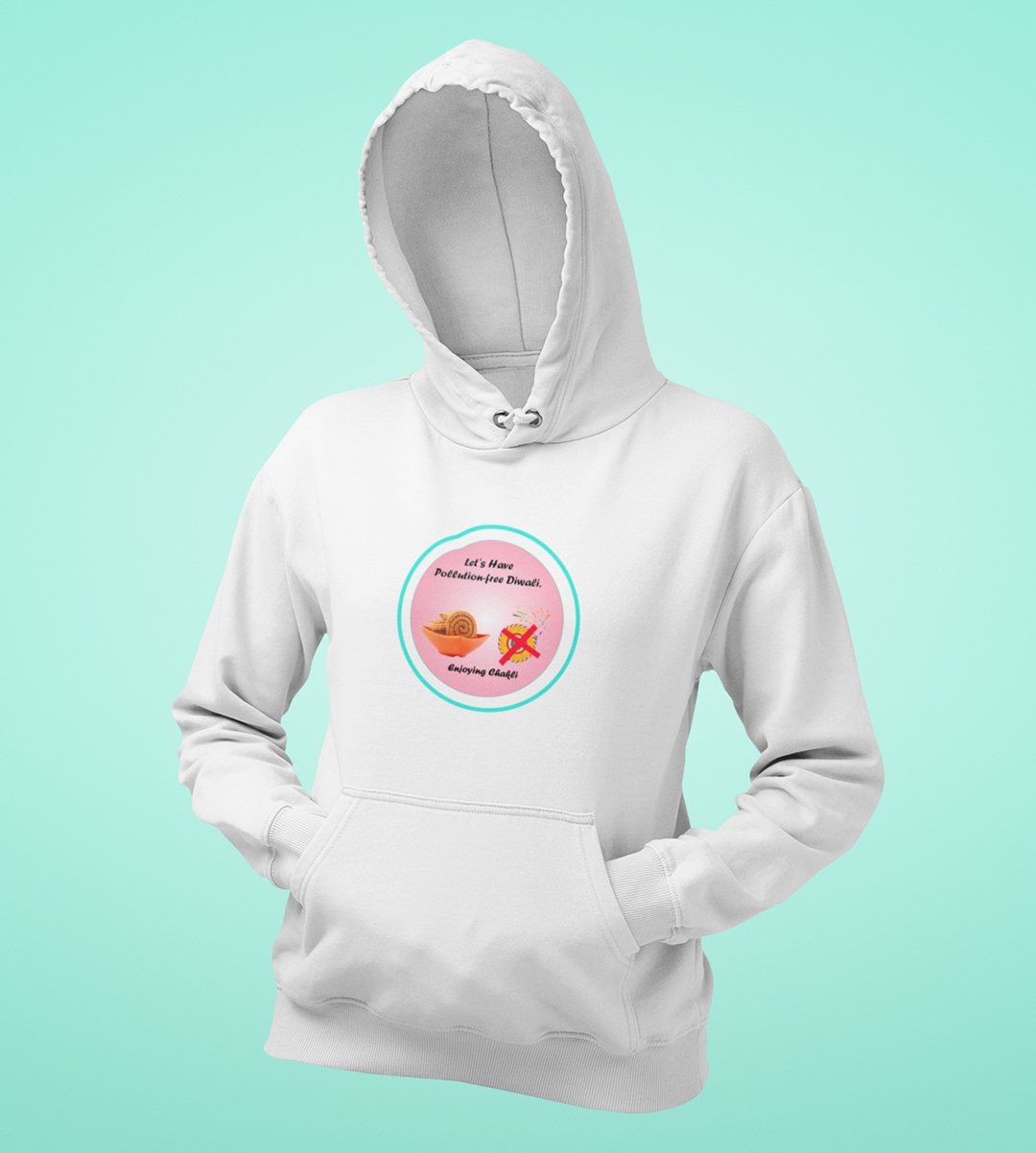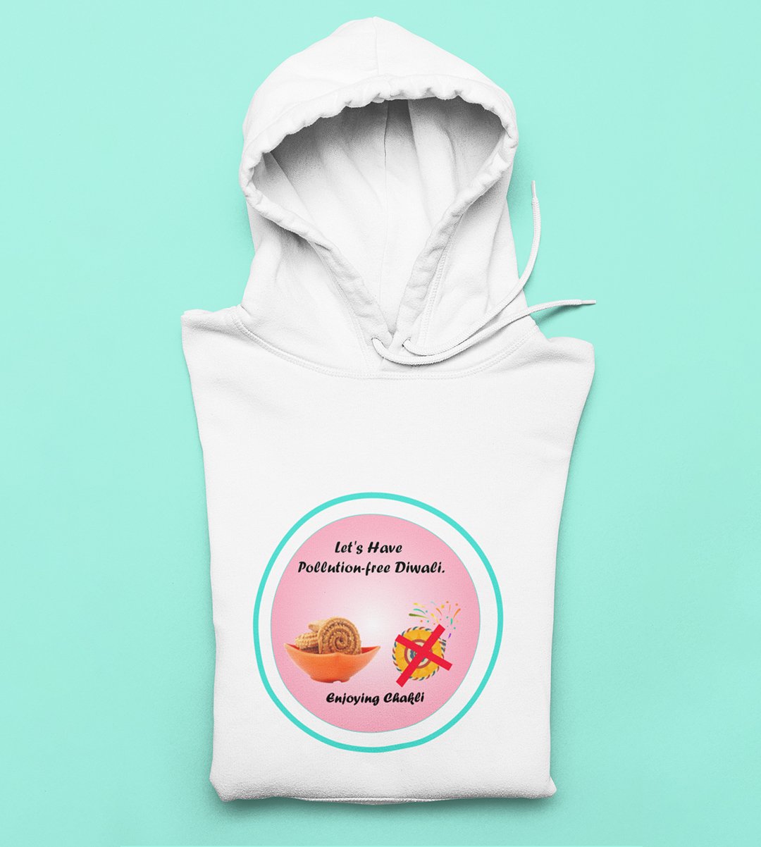 Embrace the spirit of an eco-friendly Diwali with our "Eco-Friendly Diwali" White Hoodie . This design encourages responsible celebrations while enjoying delightful Chakli, a popular Diwali snack. Sip your and be a part of the movement to celebrate the festival with care for the environment.