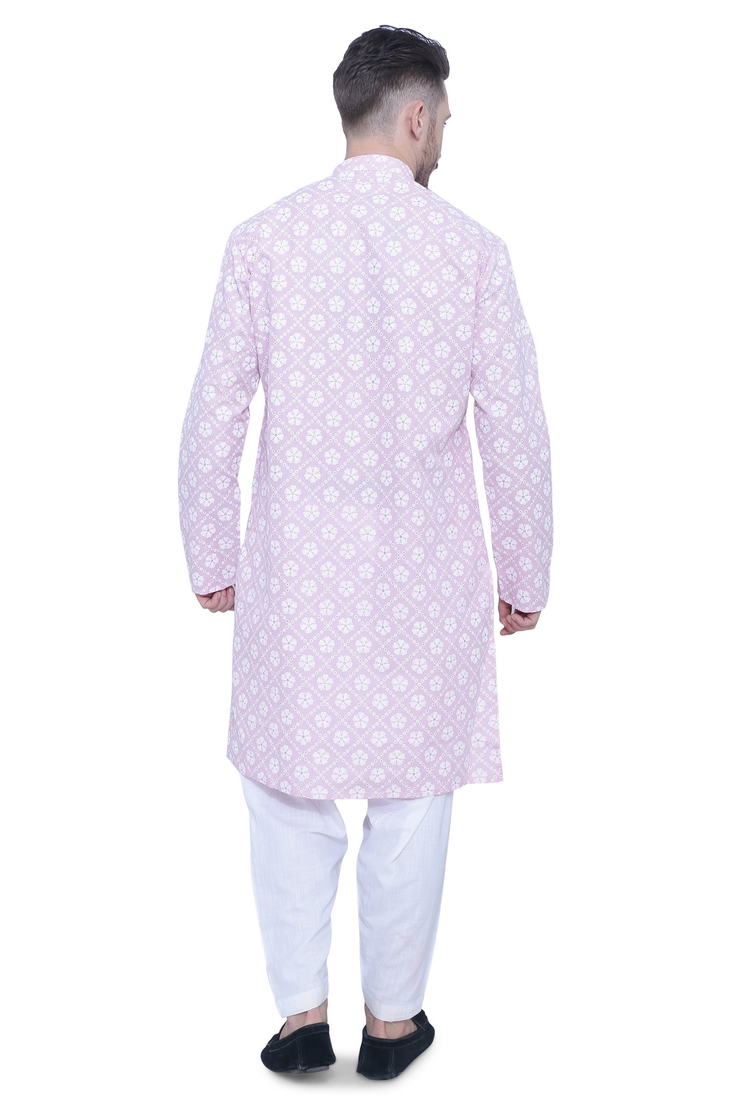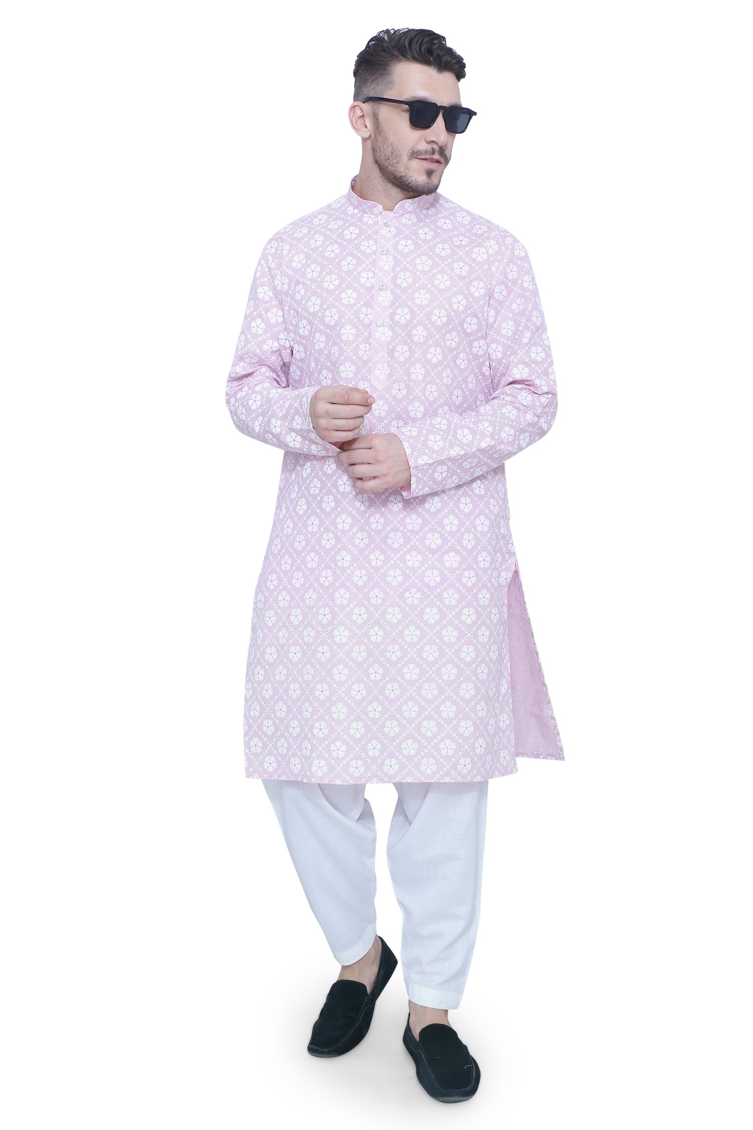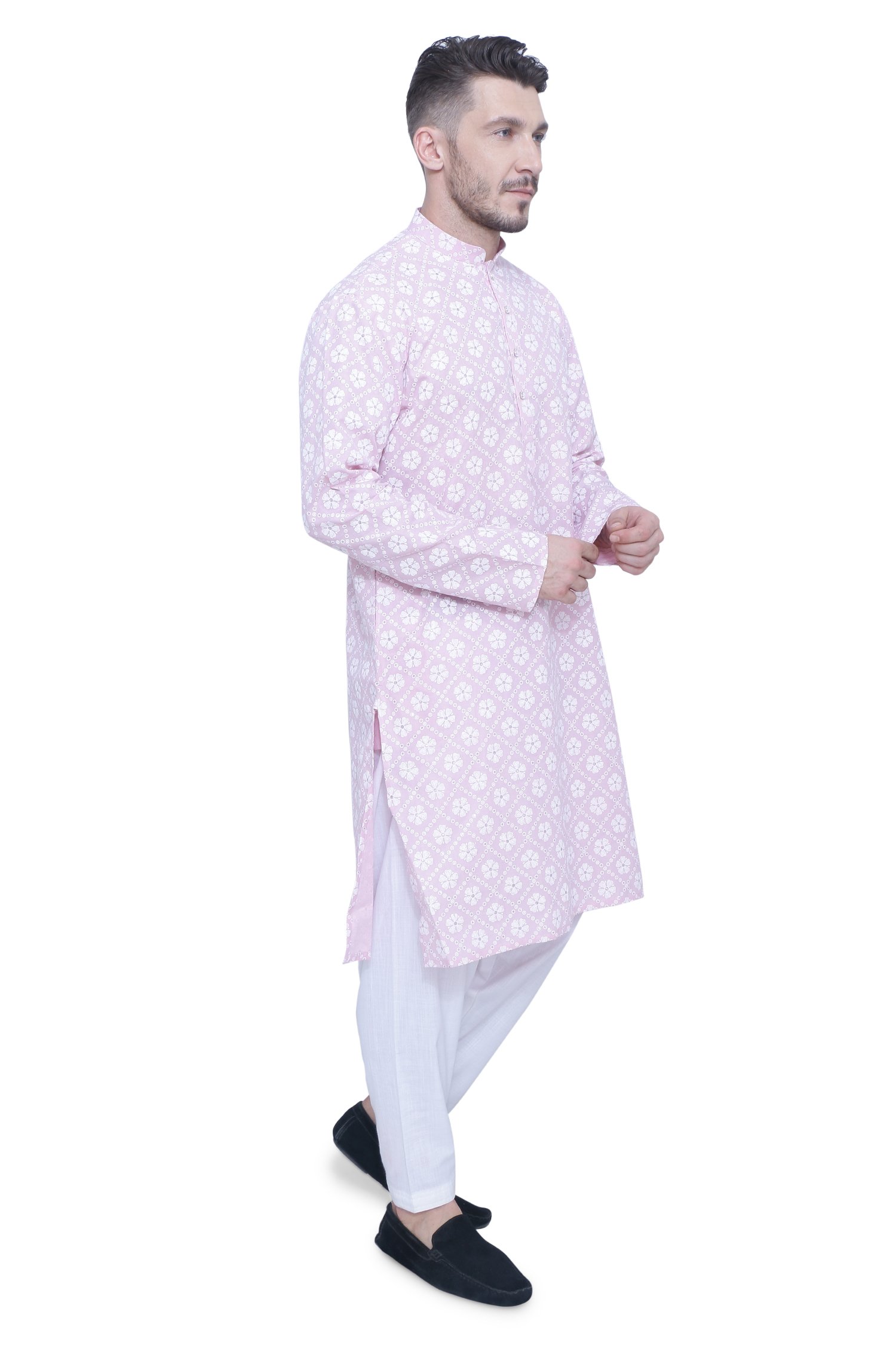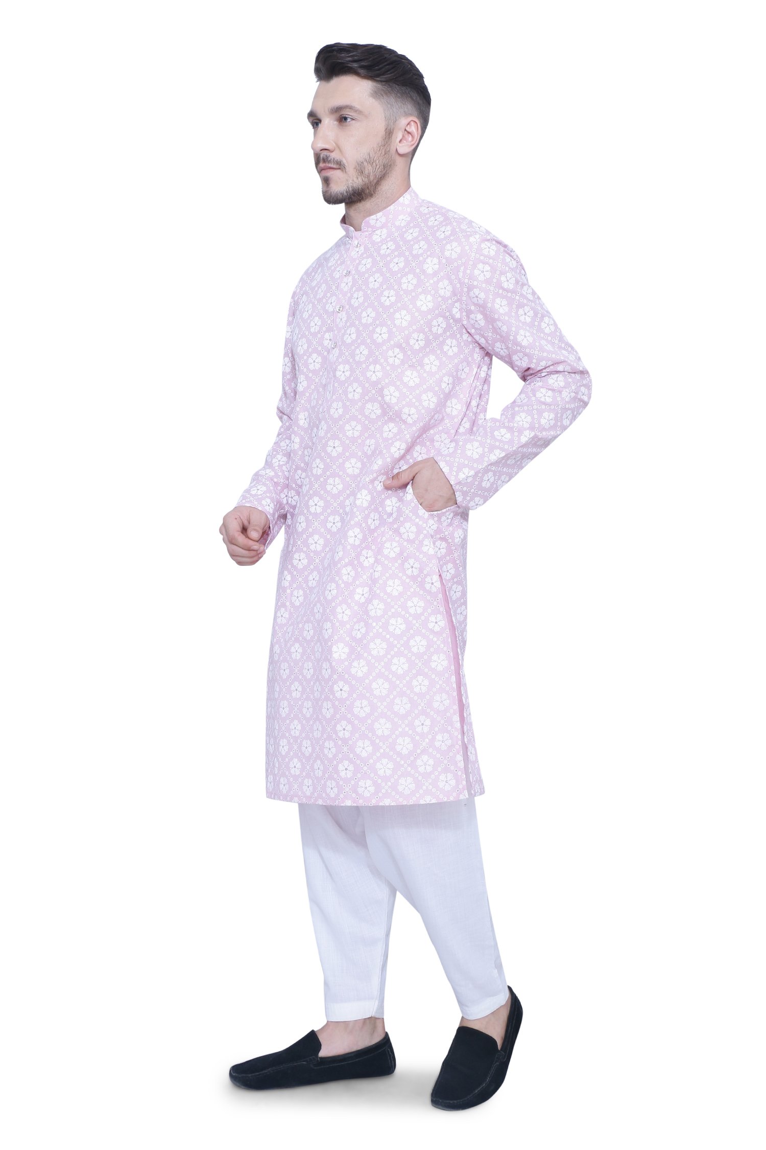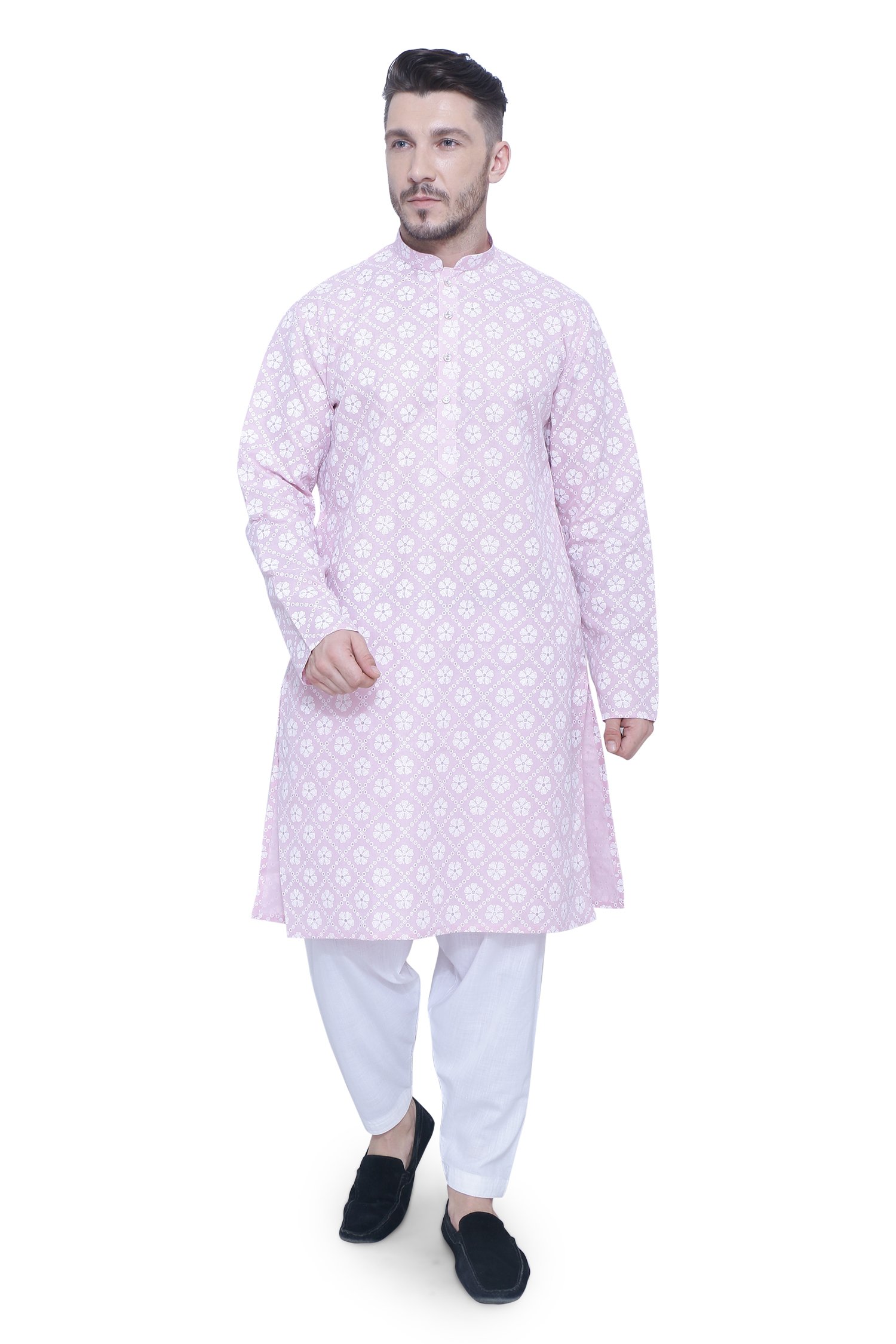 Elevate your wardrobe with our Light Pink Cotton Men's Kurta, a versatile choice for any occasion. Crafted from pure cotton, this kurta offers both comfort and breathability, making it an ideal option for warm-weather style. The stylish floral print adds an element of sophistication to your look. Enhance your style with the soothing elegance of our Light Pink Cotton Men's Kurta. The combination of pure cotton, a soft color, and a floral print makes it a versatile choice for your wardrobe. Stay comfortable and stylish in this unique kurta suitable for any occasion.