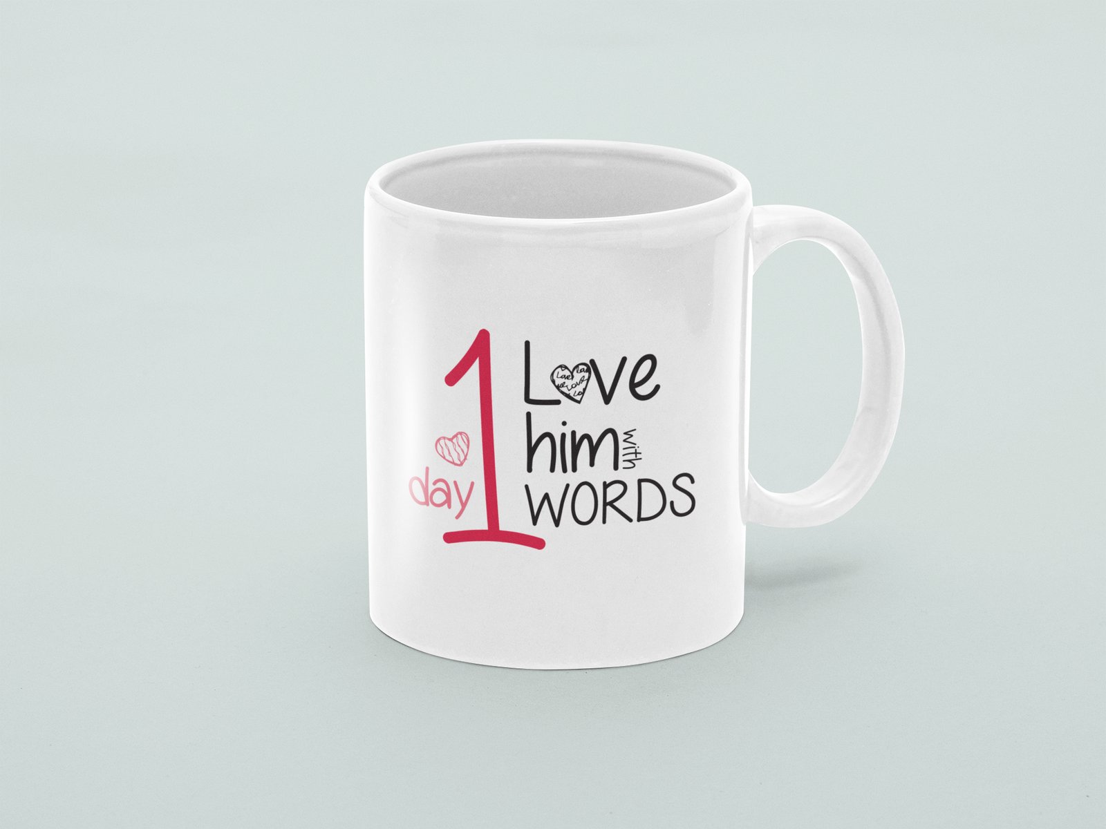 Love Him With Words - valentine themed printed ceramic white coffee and tea mugs/ cups
