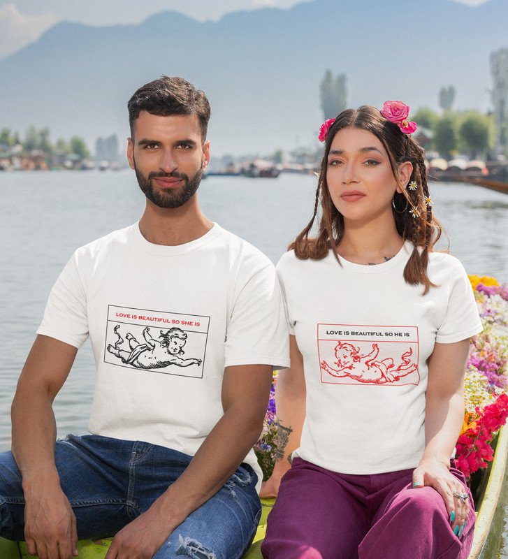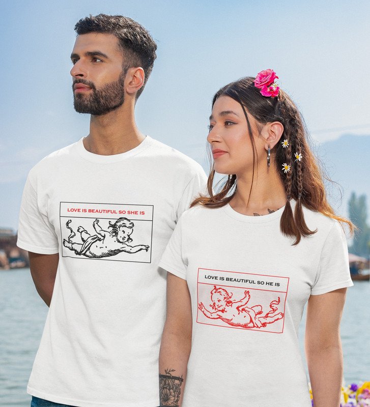 Love Is Beautiful So She Is/ Love Is Beautiful So He Is, Printed (White) T-shirts For Couples