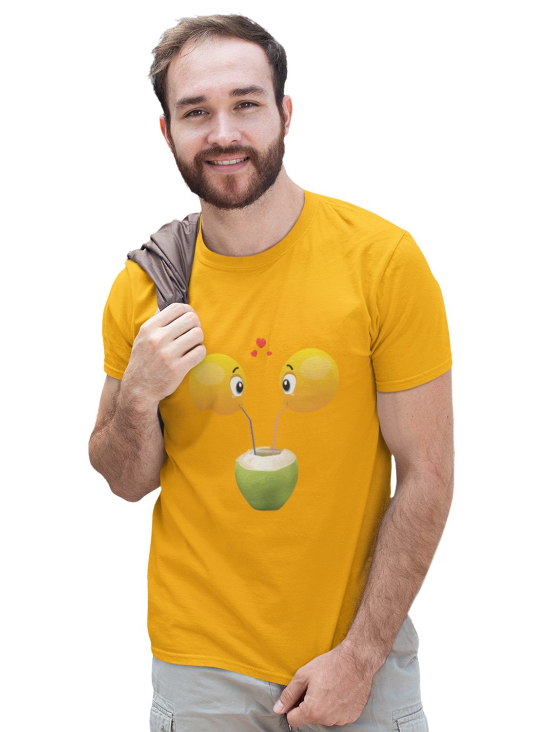 Loveable Emoji Couple Drinking Coconut Water Printed T-shirt (Yellow) - Clothes for Emoji Lovers - Suitable for Fun Events - Foremost Gifting Material for Your Friends and Close Ones