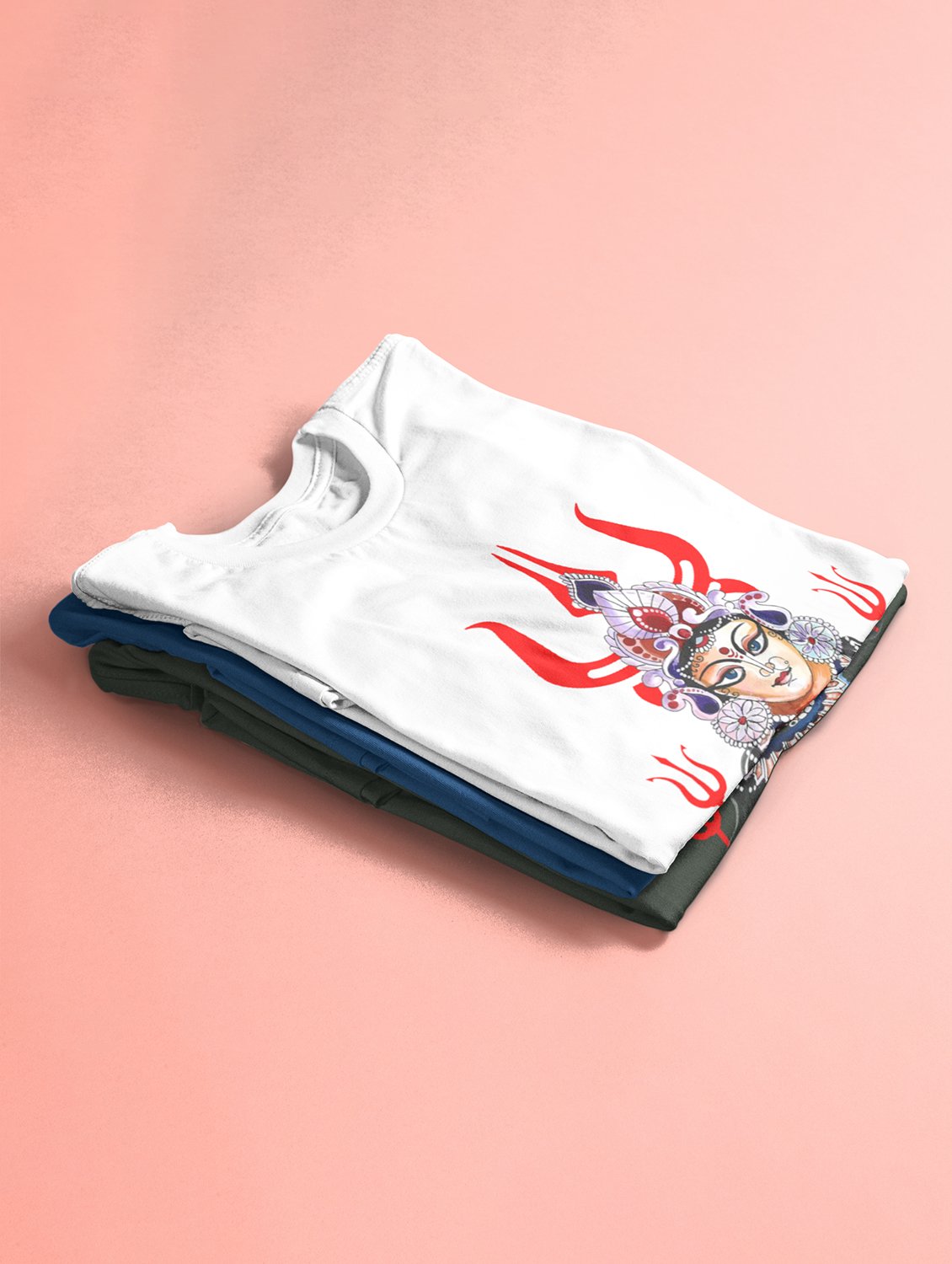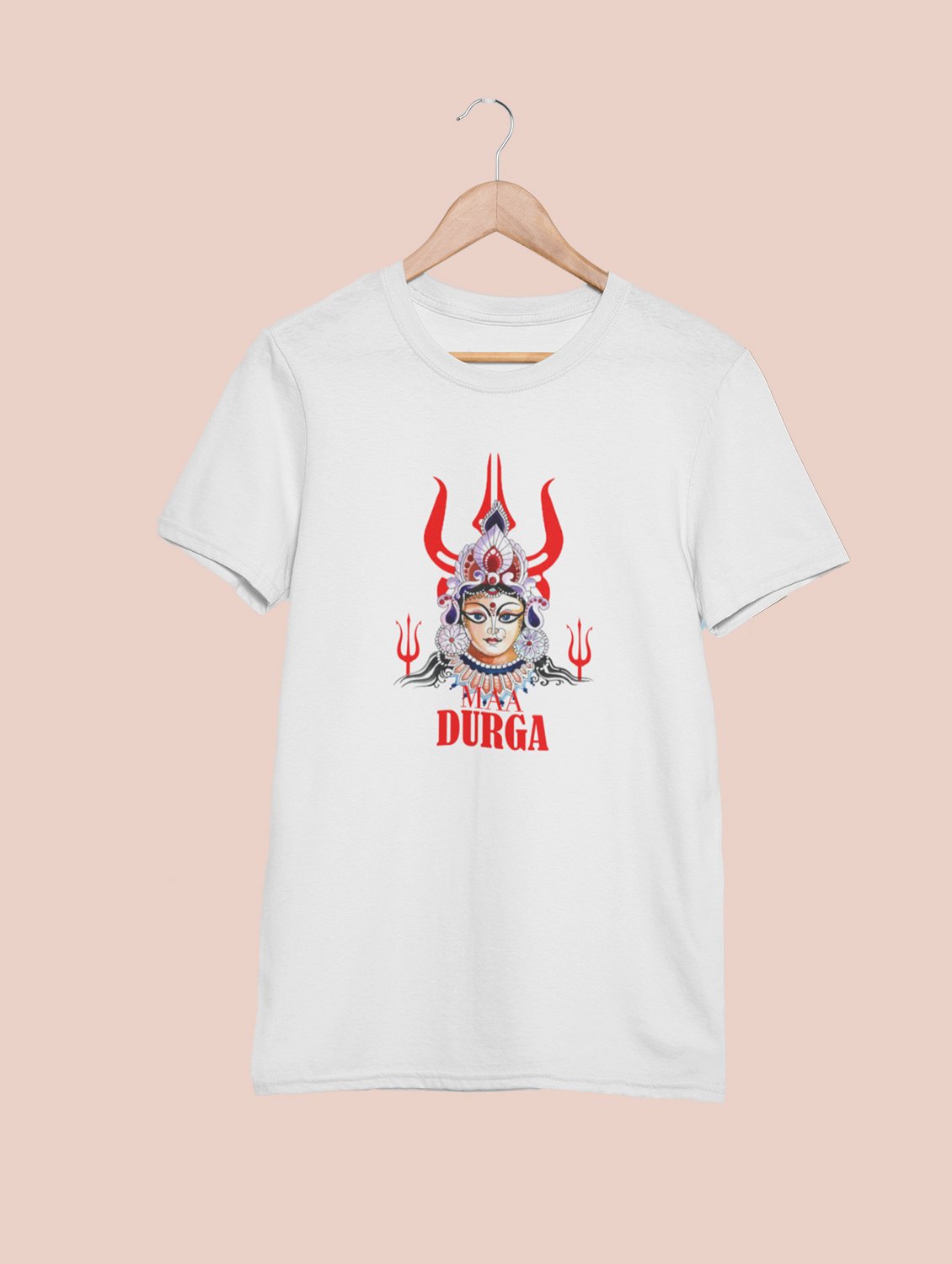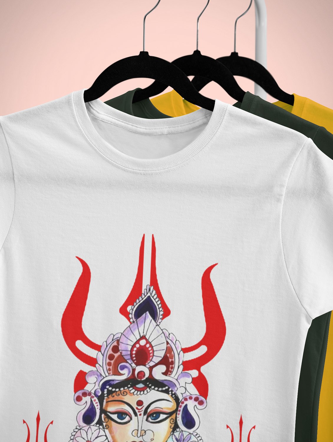 Maa durga (3 trishuls) printed unisex adults round neck cotton half-sleeve white tshirt specially for Navratri festival/ Durga puja