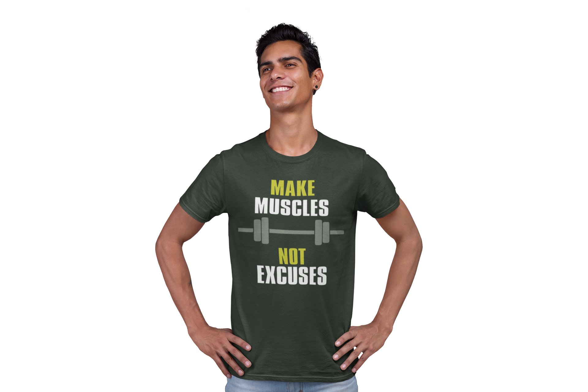 Make Muscles, Not Excuses, Bar Symbol, Round Neck Gym Tshirt - Foremost Gifting Material for Your Friends and Close Ones