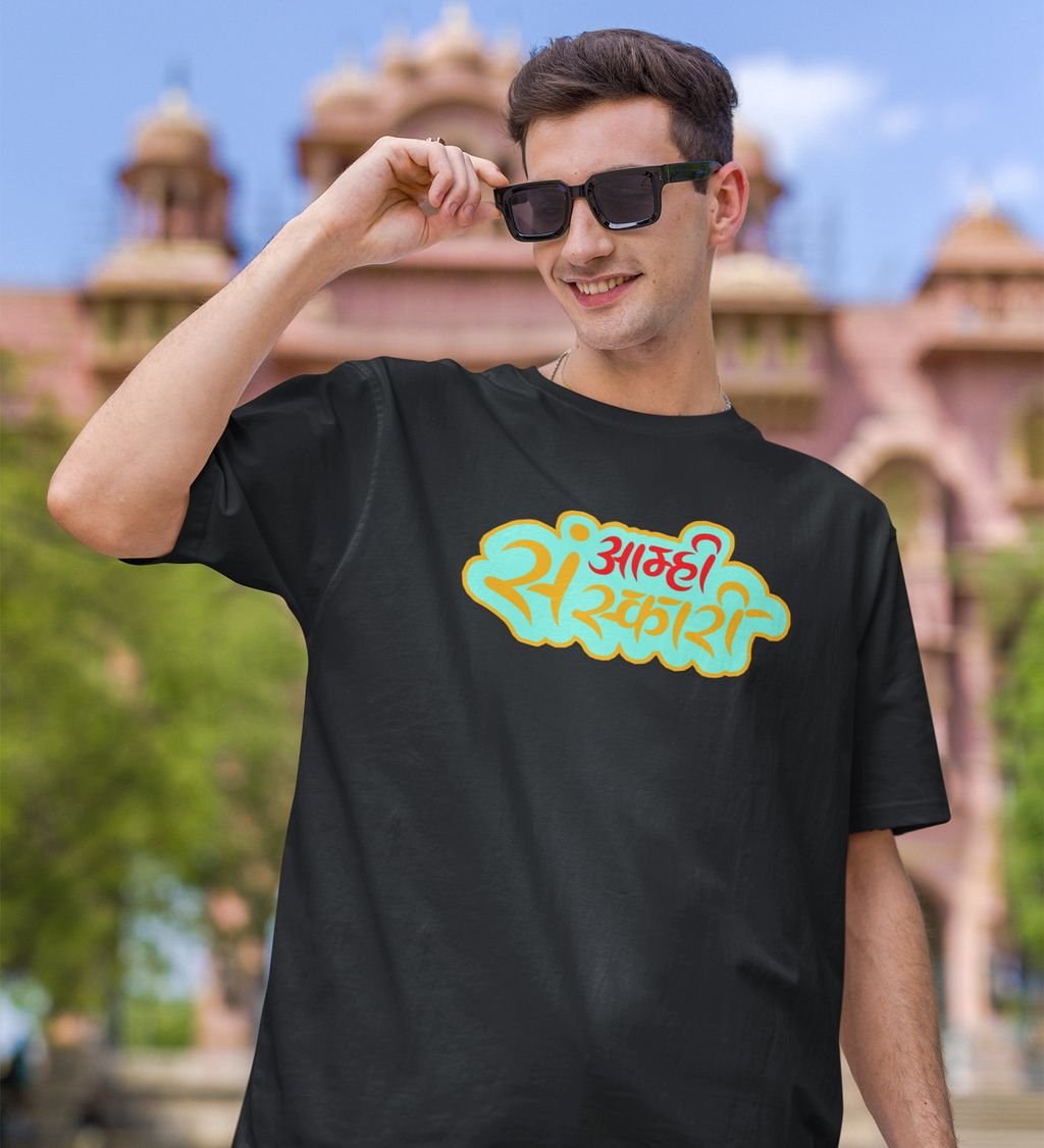 Marathi Masti Black Round Neck Cotton Half Sleeved Men T Shirt with Printed Graphics