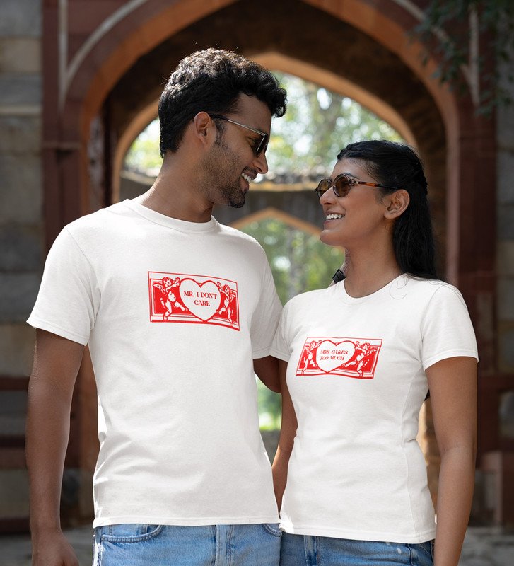 Mr Cares Too Much/ Mrs I Don't Care, Printed (White) T-shirts For Couple