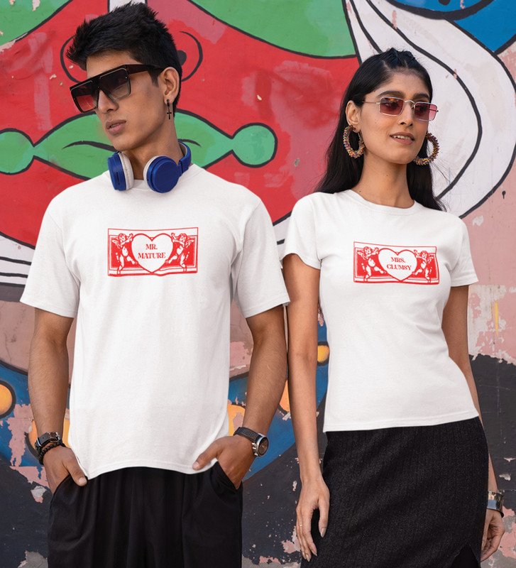 Mr Mature/Mrs Clumsy (White) T-shirts Printed For Couples