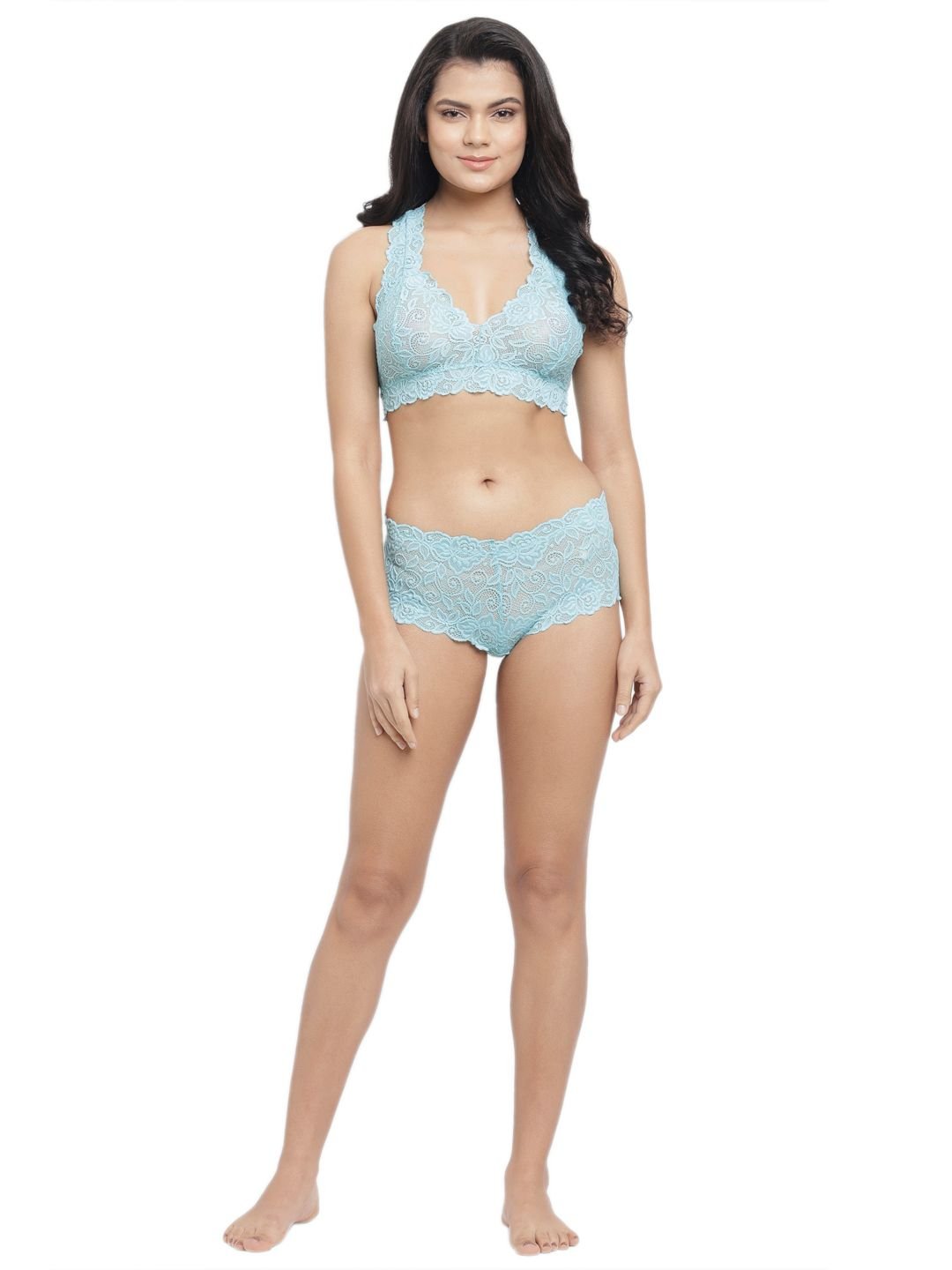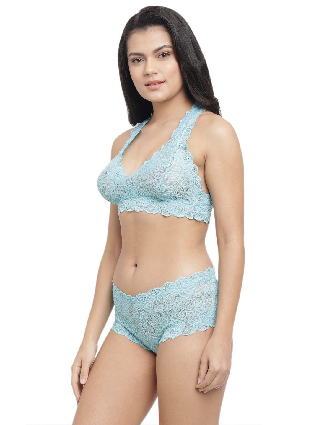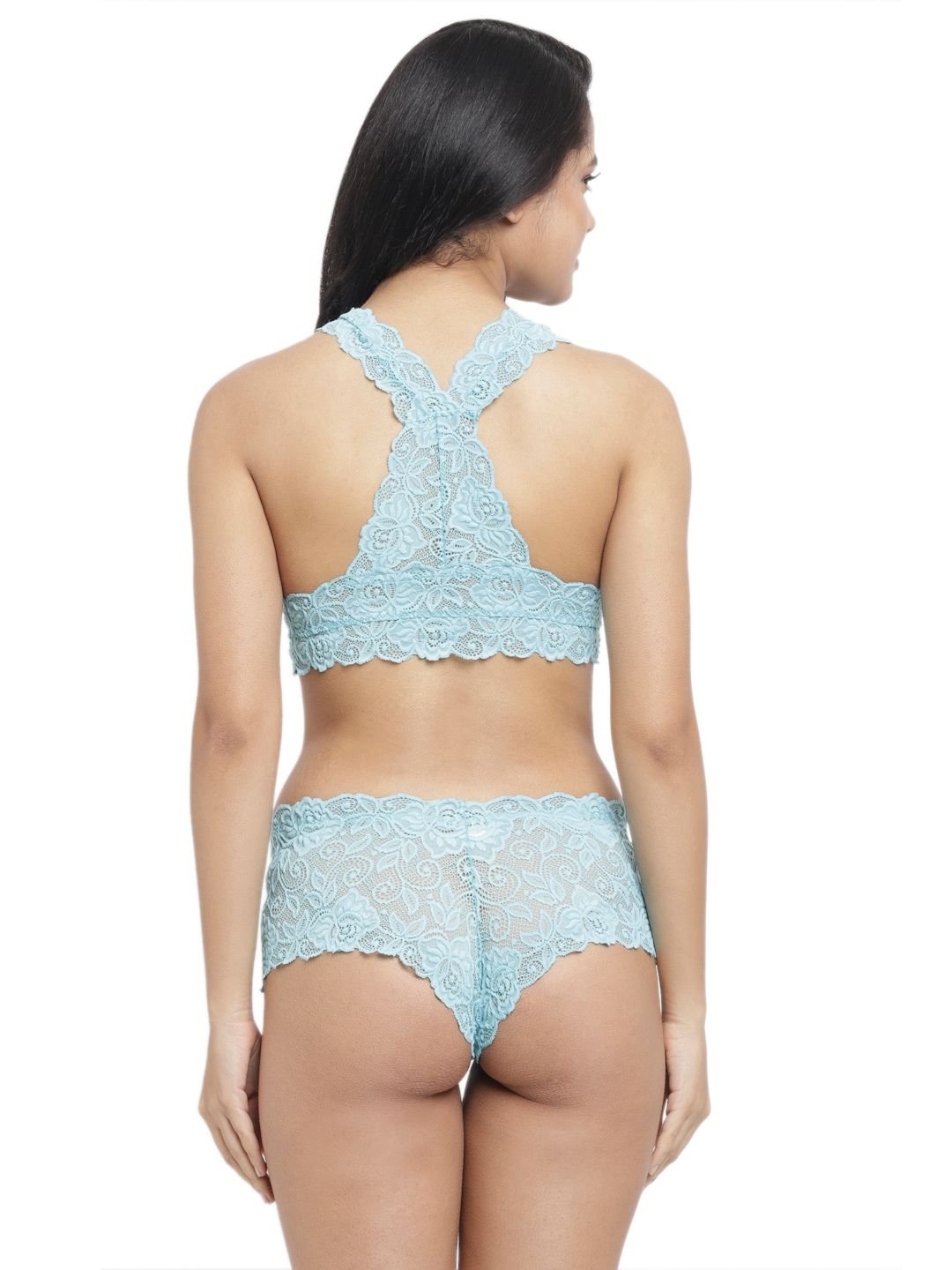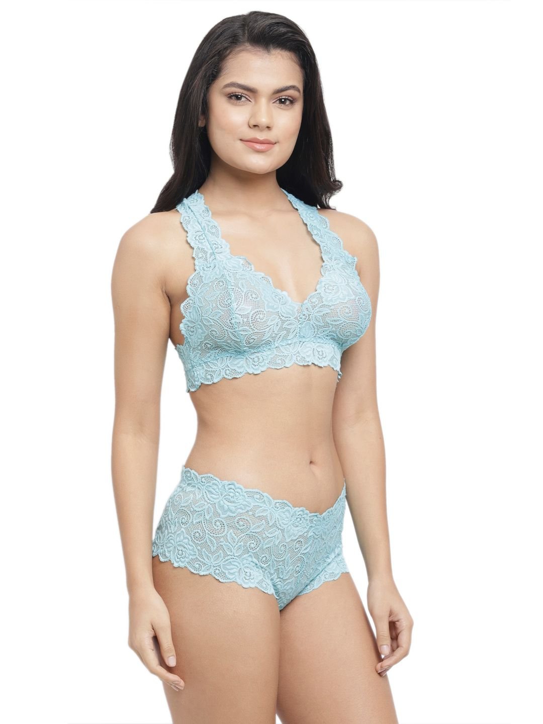 Set of lace bra Non-padded non wired lace bra with a deep neckline. Matching low waist panty lace cups,adjustable halterneck strap,back closure and matching lace thong panty with cutout and strap detail.These are skin friendly inner wears lovely set of double strap back bra and crotchless g-string thong low rise panty has delicate lace embellishment.
