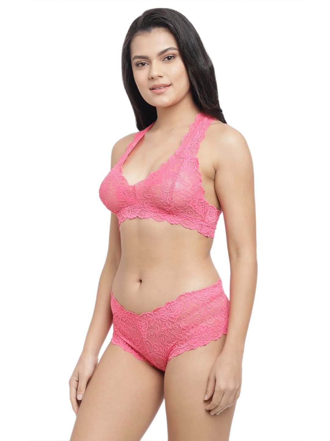 Set of lace bra Non-padded non wired lace bra with a deep neckline. Matching low waist panty lace cups,adjustable halterneck strap,back closure and matching lace thong panty with cutout and strap detail.These are skin friendly inner wears lovely set of double strap back bra and crotchless g-string thong low rise panty has delicate lace embellishment.