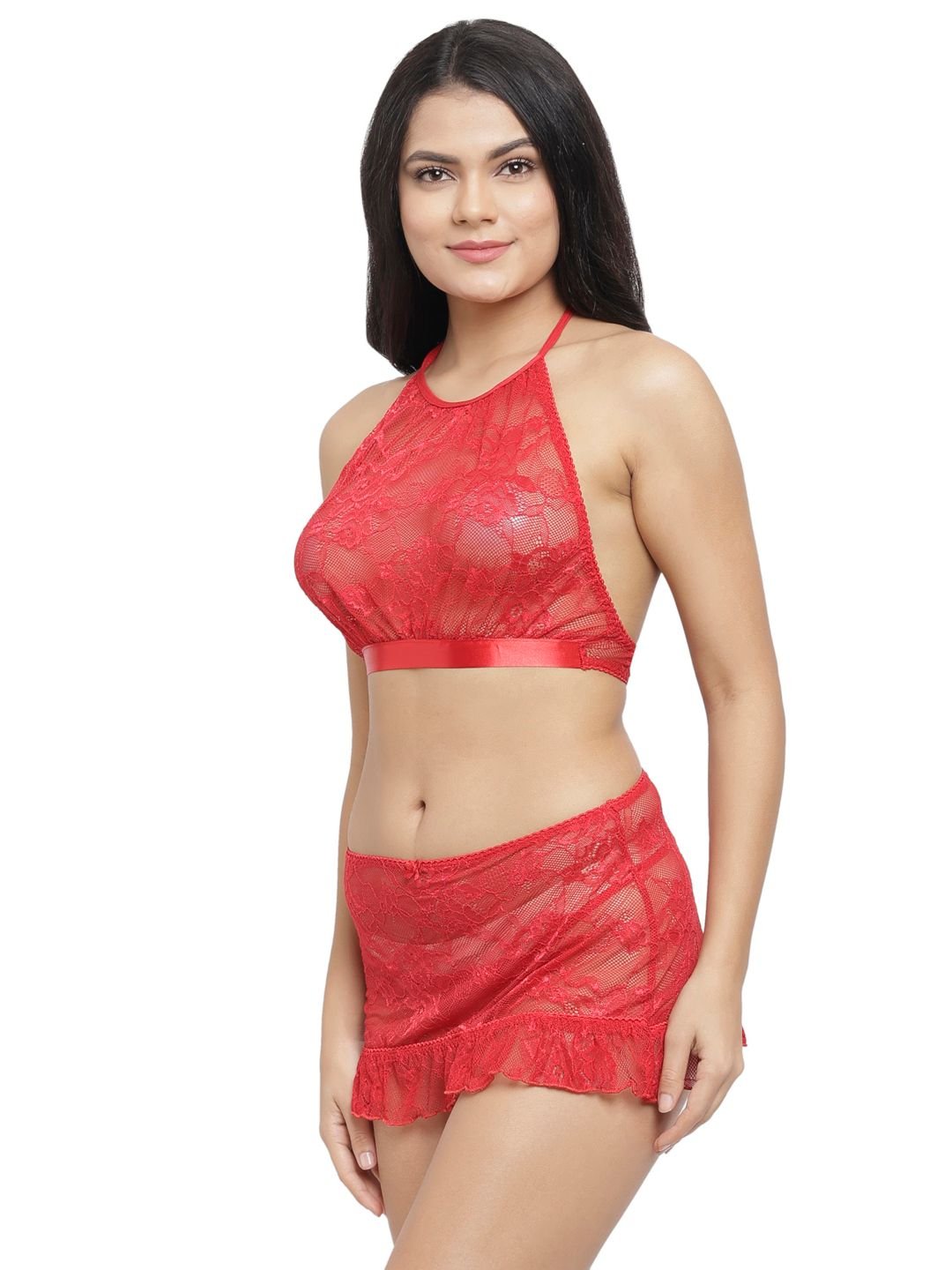 Set of lace bra Non-padded non wired lace crop top bra with a high neckline. Matching mini skirt,lace cups,adjustable halterneck strap,back closure and matching lace g-string panty.These are skin friendly inner wears lovely set of crop top bra and lace skirt g-string thong low rise panty has delicate lace embellishment.