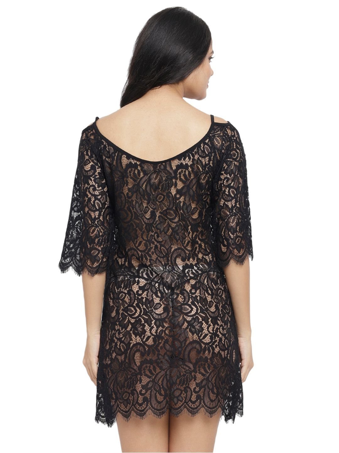 N-Gal Women's Polyester Lace Knee Length Bridal Short Nighty Night Gown Nightwear with G-String_Black