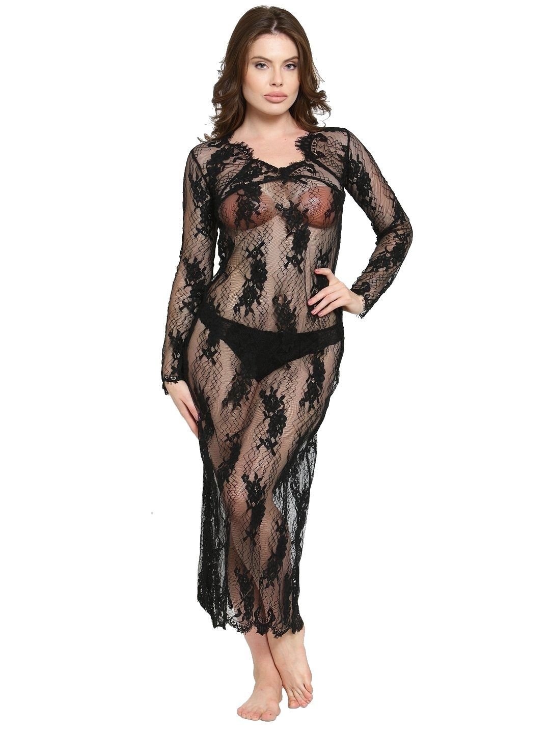 N-Gal Women's Polyester Spandex Diamond Neckline Long Sleeves Floral Lace Nightgown with G-String_Black