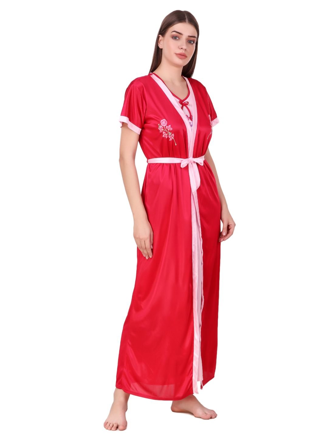 N-Gal Women's Satin Floral Pattern Embroidered Royal Long Nighty Gown with Robe Lingerie 2 Pcs Nightwear Set, Red