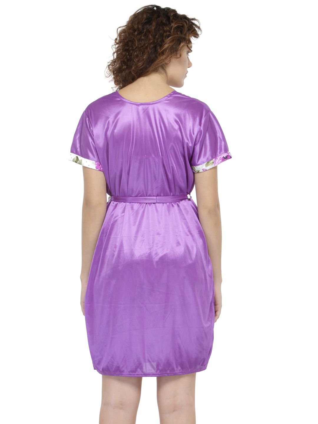 N-Gal Women's Satin Floral Pattern Short Nighty Robe Nightwear_Purple