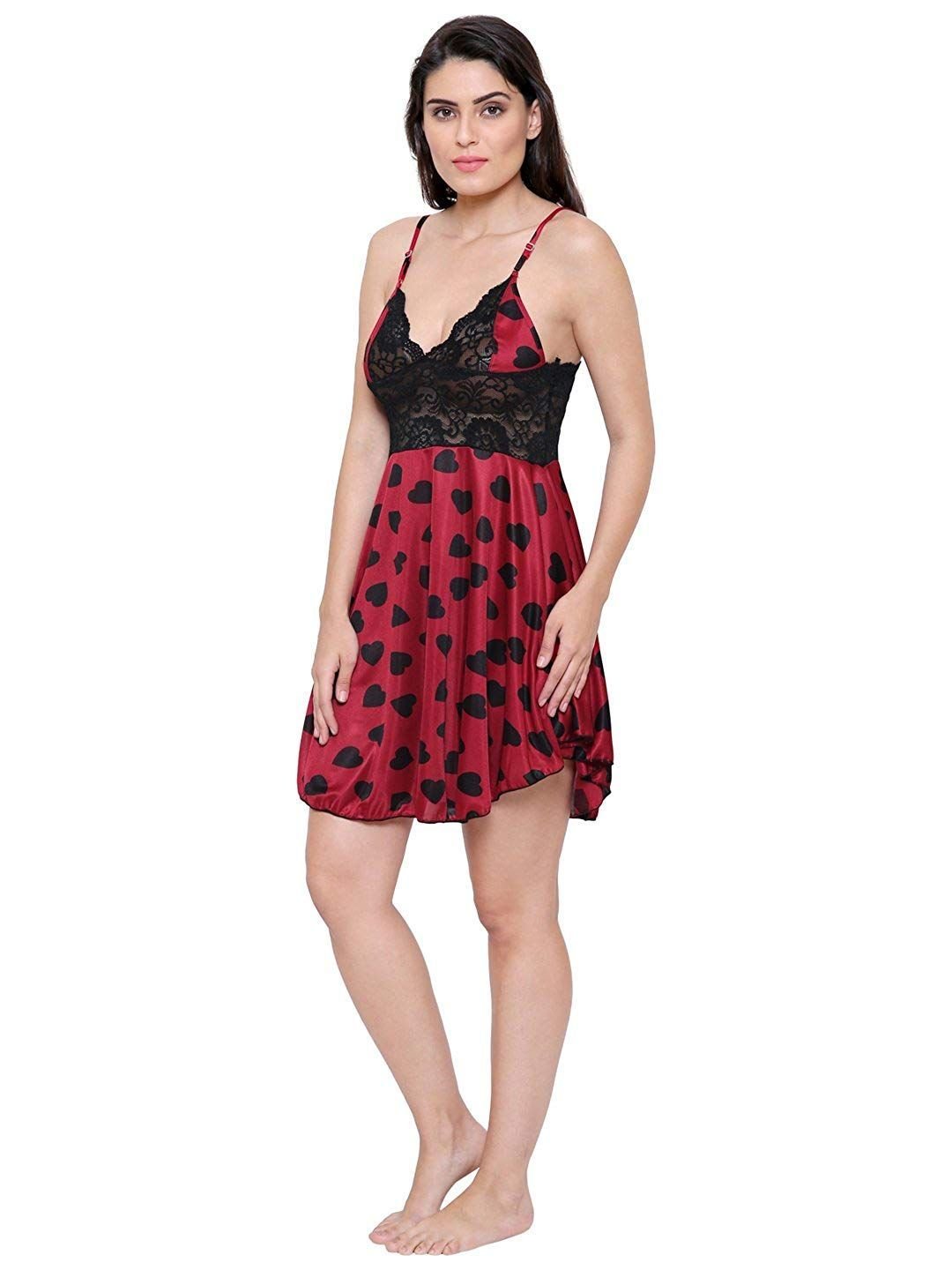 N-Gal Women's Satin Heart Print Babydoll Dress Nightwear_Maroon