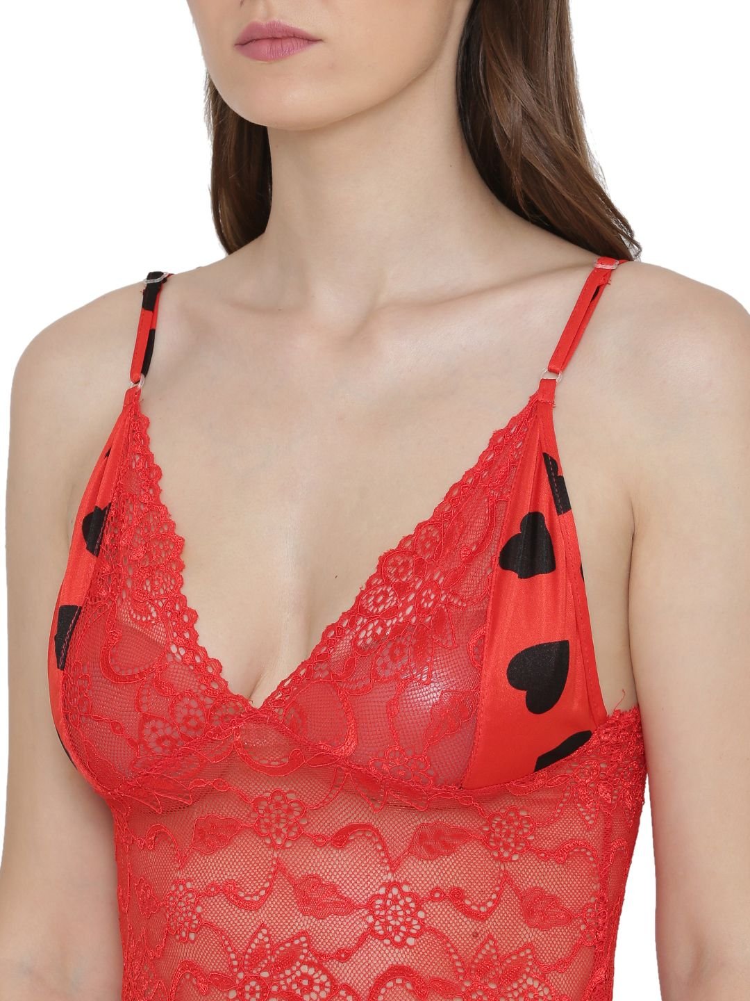 N-Gal Women's Satin Heart Print Babydoll Dress Nightwear_Red